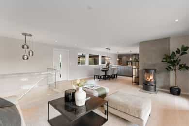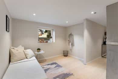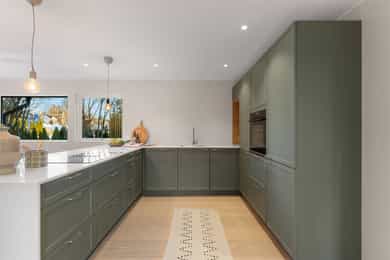 1. etasje: Entré, gang, 2 bad/wc, kjøkken - spisestue, stue m /trapp og 3 soverom. U. etasje: Kjellerstue, garderobe, gang, bad/wc, 2 soverom og 2 boder. Terrasse på ca. 28 m² med utgang fra stue. Trapp til hage. Markterrasse på ca. 18 m² ved inngangsparti. Kjøkken: Velutstyrt Kvik kjøkken med matte glatte fronter. Kompositt benkeplate med underlimt vaskekum og nedfelt induksjon platetopp. Integrert stekeovn, oppvaskmaskin og kjøl/frys. Halvøy mot spisestue. Komfyrvakt og waterguard. Integrert kullfilter avtrekksvifte i platetopp. Bad i 1. etasje med adkomst fra hovedsoverom: Bad fra 2025 med dusjhjørne med dører i herdet glass. Regn og hånddusj. Servant med baderomsmøbel. Speil med LED lys over servant. Vegghengt toalett. Elektrisk styrt vifte. Tilluft via dørterskel. Flislagt gulv med varmekabler. Senket og malt platehimling med LED belysning. Flislagte vegger. Hulltaking er ikke foretatt da badet er nybygget i 2025 og det foreligger dokumentasjon. Bad/wc II i 1. etasje med adkomst fra gang: Bad fra 2025 med dusjhjørne med dører i herdet glass. Regn og hånddusj. Servant med baderomsmøbel. Speil med LED lys over servant. Vegghengt toalett. Senket og malt platehimling med LED belysning. Flislagte vegger. Flislagt gulv med varmekabler. Elektrisk styrt vifte. Tilluft via dørterskel. Hulltaking er ikke foretatt da badet er nybygget i 2025 og det foreligger dokumentasjon. Bad/wc i kjeller med adkomst fra gang: Bad fra 2025 med frittstående badekar og dusjhjørne med dører i herdet glass. Regn og hånddusj. Servant med baderomsmøbel. Speil med LED lys over servant. Vegghengt toalett. Senket og malt platehimling med LED belysning. Flislagte vegger. Flislagt gulv med varmekabler. Elektrisk styrt vifte. Tilluft via dørterskel. Hulltaking er ikke foretatt da badet er nybygget i 2025 og det foreligger dokumentasjon. Bod: Benkeplate med nedfelt utslagsvask. Underskap. Tilpasset for vaskemaskin/tørketrommel under benkeplate. Flislagt gulv med varmekabler. Malte veggflater. Waterguard. El. styrt vifte og tilluft via dørterskel. V. bereder 250 l. Plassert i bod, kjeller. Overflater: Gulvflater: 1 stavs eikeparkett. Fliser i bod. Veggflater: Malte flater. Nye gipsplater. Nymalte overflater i 2025. Himlinger: Malte plater. Nye plater. Nymalte overflater i 2025. Innfelt LED belysning i himling i stue, kjøkken, kjellerstue, bad, soverom i underetasje, vaskerom og garderobe. Takhøyde i stue 1. etasje = 2,38 m. Takhøyde i kjellerstue = 2,28 m. Takhøyde i soverom kjeller = 2,11 m. Ildsted: Elementpipe fra byggeår. Pipeløp er ikke rehabilitert. Peisovn i stue 1. etasje fra 2025. Murt peis med innsats i kjellerstue. Trapp: Hvitmalt tretrapp med heltre inntrinn. Åpne opptrinn. Rekkverk i glass. Stusstrinn er montert for å forhindre risikabelt store åpninger mellom trinnene. Innvendige dører: Boligen har malte 1 - speil dører. Terrasse: Fra stue er det utgang til dels overbygget terrasse. Trapp til hage. Gulv belagt med impregnert trebord. Imp. levegg. Nye terrasse fra 2025. Vinduer: Boligen har malte trevinduer med 2 lags isolerglass/lydisolert vinduer. Lysgraver etablert i soverom og kjellerstue, kjeller. Årstall: 2025. Dører: Fabrikkmalt ytterdør med isolerglass. Malt terrassedør i tre med 2 lags isolerglassfelt. Årstall: 2025. Elektrisk anlegg: Automatsikringer. Plassert i bod, kjeller. Nye automatsikringer, elektriske ledninger, stikk og brytere fra 2025. Nytt inntak.
