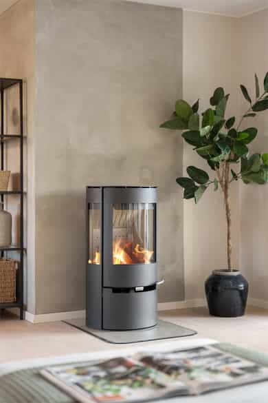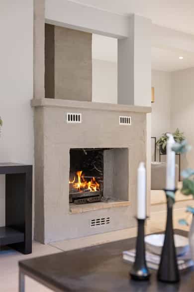 Elektriske oppvarming. Varmekabler på baderom og vaskerom. Varmefolie i oppholdsrom, kjeller. Peis med vedfyring i stue. Peis med vedfyring, kjellerstue.