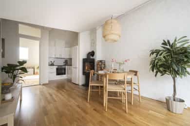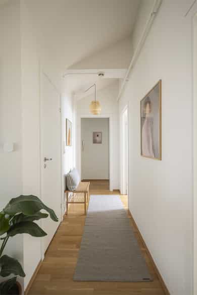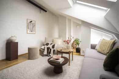 Entré: Innbydende entré med praktisk skyvedørsgarderobe med glassfronter som gir rikelig med plass til oppbevaring av yttertøy og sko. Stue: Stuen har god plass til sofa med tilhørende møblement, og det medfølger lerret på vegg. Rommets størrelse gir fleksible møbleringsmuligheter og legger til rette for ulike sosiale soner. Her er det også god plass til en hyggelig sittegruppe, perfekt for middager med venner og familie. I 2020 ble det satt inn to nye takvinduer. Takterrasse: Boligen har en solrik takterrasse på ca. 7 kvm med god plass til utemøbler. Takterrassen er vendt mot rolig bakgård og byr på sol fra ca. kl. 9-18 på sommerstid. Kjøkken: Kjøkken med glatte fronter og god plass til lagring i både over og underskap. Kjøkkenet er utstyrt med integrert platetopp, stekeovn, oppvaskmaskin samt kjøl fryseskap, og har avtrekk over kokeplass. 2 soverom: Hovedsoverommet er av god størrelse med plass til seng, garderobeskap og kommode. Leilighetens andre soverom er også svært romslig. Fin plass til seng, skrivepult og kommode. Rommet brukes idag som et kontor. Bad: Bad fra 2017 som er utstyrt med behagelig gulvvarme og innredet med klosett, servant nedfelt i innredning (2025), speil med lys og dusjkabinett. Det er også elektrisk styrt vifte. Vaskemaskin medfølger (2024).