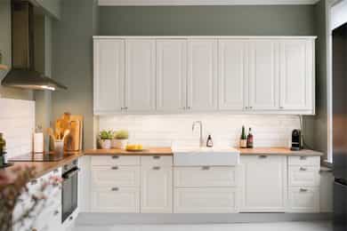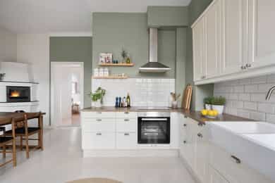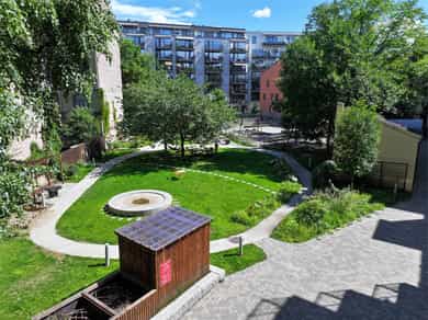 • Fantastisk spisekjøkken med flott utsyn inn i stor og frodig bakgård tegnet av landskapsarkitekt
