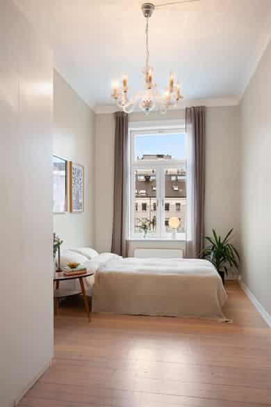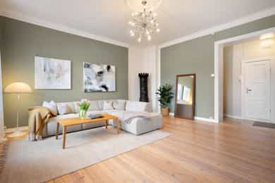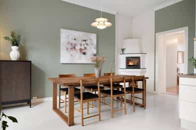 • Klassiske detaljer; furugulv, rosett og stukkatur