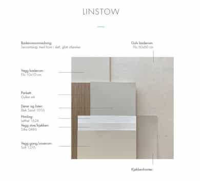 LINSTOW Baderomsleveranse fra HTH: FRONT: ZP Focus Beige NCS S2005-Y20R SERVANT: Heldekkende Prisma /Lava matt hvit kompositt HÅNDTAK: 1353 lys brun Beslagdesign SPEIL med ledlys Baderomsinnredning: Servantskap med front i slett, glatt utførelse. Gulv baderom: Flis 60x60 cm Vegg baderom: Kombinasjon av 2 ulikeflisformat, 60x60 cm flis (samme som gulv). 10x10 cm flis over brystning. Fug med tilsvarende farge som flis, 2-3 mm tykk. Sparklet og malt nedforet gipshimling. Ved bruk av badekabiner kan det bli metallhimling. VVS: - Opplegg for vaskemaskin. - Vegghengt toalett. - Servantbatteri: ettgreps med oppløft (propp). - Dusjbatteri med termostat ANNET: - Servantskap med front i slett, glatt utførelse. - Benkeplate og opplegg for vaskemaskin under benk, eller som vaskesøyle. - Rettvinklede dusjvegger med rillet glass. - Vannbåren varme i badegulv. ELEKTRO: - Innfelte downlights i tak. - Speil med integrert belysning. - Dobbelt stikk på vegg ved vask. - Stikkontakt for vaskemaskin og tørketrommel.