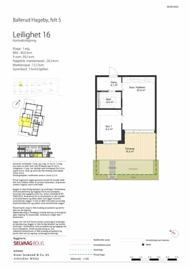 Leiligheten ligger i 1. etasje og inneholder: Entré/gang, åpen stue- og kjøkkenløsning, bad og et soverom. Fra stuen er det adkomst til en stor markterrasse på 15,5 kvm. Størrelsen på hagen inkl. markterrasse 26,5 kvm. Sportsbod i kjeller på 5 kvm. Bod vil følge leiligheten, og planlegges seksjonert som tilleggsdel til denne. Utbygger tar forbehold om annen organisering dersom det finnes nødvendig eller formålstjenlig. Privat hageareal utgjør generelt arealet til innside hekk. Der hvor hekken skiller to private utearealer, vil grensen mellom hagene være midt hekk. Generell romhøyde i 1.etg. er 2,6 m. Himlingshøyde i nedhimlet areal er minst 2,2 m. INNVENDIGE OVERFLATER Parkett: Gyllen eik. Parkett 1 stavs, 185 mm eikeparkett. Dører og lister: Blek Sand 1016 Himling: Letthet 1624 Vegg stue/kjøkken: Silke 0486 Vegg gang/soverom: Soft 1276 TERRASSE - Utelampe med innvendig bryter. - Dobbel stikkontakt. - Frostfri utekran. - Skillevegger og beplantning (hekk) iht utomhusplan. VIKTIG INFORMASJON Salgsprospekt og prosjektbeskrivelsen er utarbeidet for å orientere om prosjektets generelle bestanddeler, funksjoner og planlagte organisering, og er således ikke en komplett beskrivelse av leveransen. Det vises for øvrig til kontraktstegninger og kjøpekontrakt med vedlegg. Alle illustrasjoner, 3D animasjoner, skisser, ”møblerte” plantegninger m.m. er kun ment å danne et inntrykk av den ferdige bebyggelsen, og kan ikke anses som endelig leveranse. Inntegnet utstyr/ inventar/ hvitevarer medfølger ikke, og det kan derfor fremkomme elementer i presentasjonsmaterialet som ikke inngår i leveransen. Generelle beskrivelser av prosjektet i salgs- og markedsføringsmateriell vil ikke passe for alle leilighetene. Kjøper oppfordres derfor særskilt til å vurdere solforhold, utsikt, beliggenhet i forhold til terreng og omkringliggende eksisterende og fremtidig bygningsmasse m.v. før et eventuelt bud inngis. Ved eventuelle motstrid i salgsmateriale, vil kontraktstegninger ha forrang. Sjakter, VVS føringer og annet teknisk anlegg er ikke endelig inntegnet, og nedkassinger/foringer i himling vil stedvis kunne forekomme. Plassering av sjakt kan endres, herunder at sjakt kan plasseres på annen side av badet enn vist i salgsunderlaget. Forbehold inntatt i prospektet gjelder også for kontraktstegningen. Vindusplasseringen i den enkelte bolig kan avvike noe fra de generelle planer, som følge av bl.a. den arkitektoniske utformingen av bygget. Selger tar forbehold om endelig utforming av balkonger og terrasser inkl. rekkverk og overflater. Det gjøres oppmerksom på at utomhusplanen i salgsprospektet ikke er ferdig detaljprosjektert og at endringer vil kunne forekomme. Renovasjon, forstøtningsmurer, fallsikringer, belysning, fordelerskap, kummer og lignende vil bli plassert slik det finnes hensiktsmessig i forhold til terrenget. Leveranse av grøntareal og vegetasjon vil kunne avvike i forhold til utomhusplan. Ballerud Hageby utvikles med flere byggetrinn. Gjennomføring mav et stort byggeprosjekt i flere trinn vil, blant annet på grunn av løpende byggevirksomhet, kunne medføre enkelte ulemper for beboerne inntil ferdigstillelse av samtlige byggetrinn.