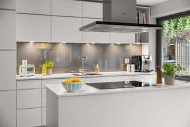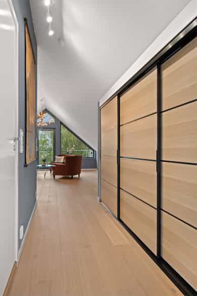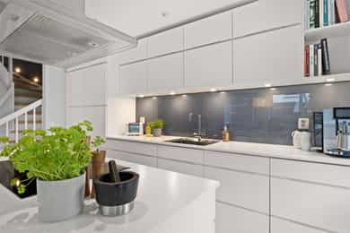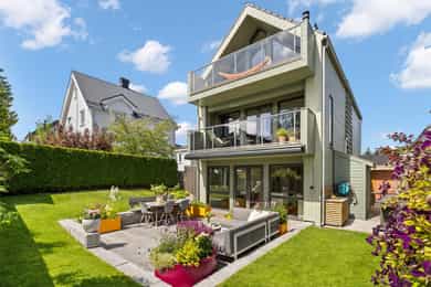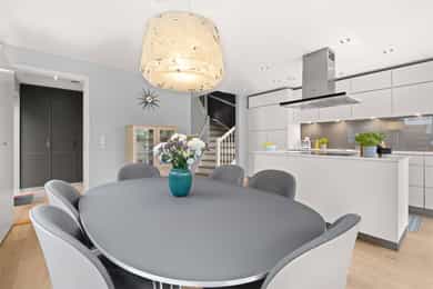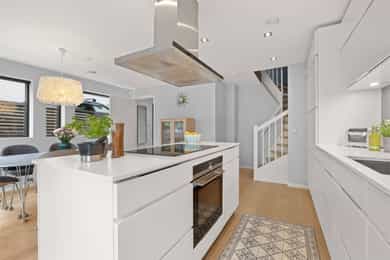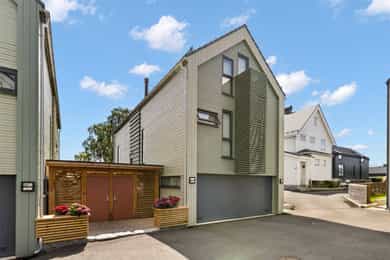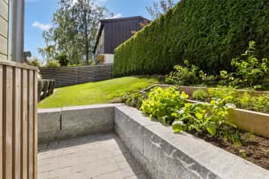 Terrasse og balkonger Utgang fra kjøkken til skjermet sydvendt markterrasse. Terrassen har elektrisk markise App styrt Somfy. Det er laget utekjøkken og bodareal. Utgang fra stue i 2. etg. til en sydvendt balkong på ca. 10 m² med tregulv. Balkongen er forøvrig utstyrt med utelys og strømuttak. Utgang fra stue i 3. etg. til en sydvendt balkong på ca. 10 m² med skråtak og tregulv. Balkongen er forøvrig utstyrt med utelys og strømuttak. Innvendige overflater Gulv er belagt med fliser og gulvvarme på begge baderom og i entré ellers parkett i øvrige rom. Vegger er belagt med 60 x 60 fliser på begge baderom ellers malte slette flater i øvrige rom. Himling er belagt med malt gipshimling og innfelte downlights i entré, kjøkken, wc, begge baderom og stue i 2. etg. ellers malte slette flater i øvrige rom. Kjøkken Kvik kjøkkeninnredning med lakkerte skapfronter, diamantglass på bakvegg, oppvaskkum, ventilator og integrerte hvitevarer som platetopp, ovn, oppvaskmaskin, kjøl/-fryseskap. Bad 2.etasje Baderomsinnredningen er bestående av servant med skuffeseksjon, speil med sidelys, vegghengt klosett, dusjhjørne med svingbare glassdører og regnfall, opplegg for vaskemaskin. Mekanisk avtrekk fra baderom. Bad 3.etasje Baderomsinnredningen er bestående av servant med skuffeseksjon, speil med sidelys, vegghengt klosett, dusjhjørne med svingbare glassdører, innfliset badekar og opplegg for vaskemaskin. Mekanisk avtrekk fra baderom. Toalettrom 1.etasje Innredningen er bestående av servant med underskap, speil med sidelys og vegghengt klosett. VVS Boligen er utstyrt med balansert ventilasjonsanlegg. Det er plassert en varmtvannsbereder på 200 L. Garasjeport måler 5,10 m bredde og 1,99 m i høyde. Lengde innvendig i garasje er 5,30 m. Innvendig garasjehøyde er 2,40 m Somfy-kompatibel markise og garasjeport. Basestasjon må påkostes av ny kjøper.