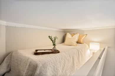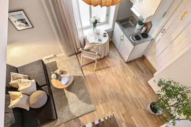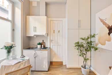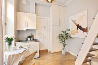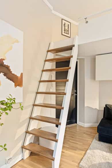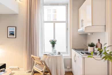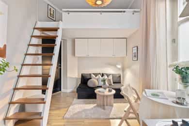 Stue: Lys og tiltalende stue med en imponerende takhøyde på hele 3,20 meter. Det er plass til en mindre sofa med bord og et lite spisebord. En stor vindusflate gir flott lysinnslipp og bidrar til en luftig atmosfære. Fra stuen leder en trappestige opp til hemsen. Kjøkken: Hybelkjøkken med glatte fronter og praktisk utforming. Helstøpt oppvaskkum med platetopp og ettgreps armatur fra FM Mattsson. Innredningen har mekanisk avtrekksvifte over stekesonen, samt integrert kjøleskap. Bad: Praktisk bad med elektrisk gulvvarme som gir god komfort. Servant med stilrent ettgreps armatur fra FM Mattsson, samt speilskap med integrert belysning. Badet er utstyrt med dusjnisje med glassdører på skinne, mekanisk avtrekk, rørfordelingsskap, bereder og gulvstående wc. Bod utenfor leiligheten: Bod i leilighetsplan med opplegg for vaskemaskin og montert automatisk vannstopper på ca. 3 kvm (medtatt som BRA-e).