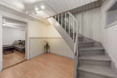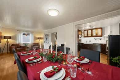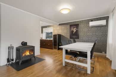 1. etasje: Entré: Fra overbygd inngangsparti, trer du inn i entré med videre tilgang til gang. Her er det god plass til sko og yttertøy. Fra entré/gang har du tilgang til trapp til kjeller og 2. etasje, samt stue. Stue: Lys stue med gode vindusflater som slipper inn rikelig med dagslys. Stuen tilbyr god møbleringsfrihet med plass til flere sittegrupper, samt spisestue. Spisestuen er naturlig plassert i tilknytning til kjøkken. Fra stuen er det utgang til terrasse. Stuen varmes opp av peisovn og varmepumpe. Kjøkken: Innbydende og romslig kjøkken med mørkebrune, profilerte fronter og laminert benkeplate. Kjøkkeninnredningen er godt tilpasset rommets utforming og har godt med skap- og benkeplass. Innredningen har integrerte hvitevarer som oppvaskmaskin, stekeovn, platetopp, mikro og kjøleskap. 2. etasje: Bad: Innbydende baderom som er pusset opp i 2022. Helfliset baderom med varmekabler i gulv. Badet er utstyrt med heldekkende servantplate over skuffeinnredning, overliggende speil, vegghengt toalett, dusjnisje og opplegg til vaskemaskin og tørketrommel. Soverom: Det er to soverom i boligens 2. etasje. Hovedsoverommet er av meget god størrelse med plass til dobbeltseng, nattbord, skrivebord og garderobeløsning. Soverom 2 er også av fin størrelse med plass til dobbeltseng, nattbord og garderobeløsning. Kjeller: Kjellerstue: Innredet kjellerstue med plass til sofagruppe og tilhørende møblement. Rommet er ikke godkjent til varig opphold. Soverom: Innredet soverom med plass til dobbeltseng, nattbord og garderobeløsning. Rommet er ikke godkjent til varig opphold.