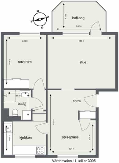 BRA-i: 55 kvm. Entré, spisestue, stue, soverom, kjøkken, bad, mellomgang.