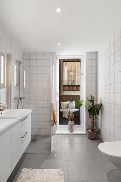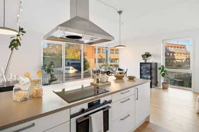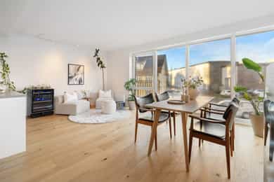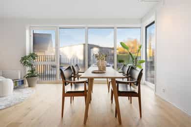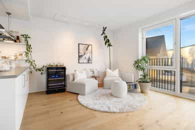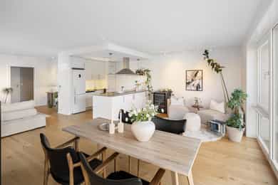 Boligen fremstår som lys og moderne, med tidsriktige materialvalg og en gjennomtenkt planløsning. Store vindusflater slipper inn rikelig med naturlig dagslys, og gir rommene en luftig og behagelig atmosfære. Innvendige overflater består hovedsakelig av parkett og fliser, mens lyse, malte vegger og listefrie overganger mellom vegg og tak bidrar til et stilrent og moderne uttrykk. Entréen er lys og åpen med god plass til å henge fra seg yttertøy. Fra entréen har man tilgang til boligens to flotte bad samt begge soverommene. Gjestebadet er helfliset med vegghengt toalett, servant med underskap, opplegg for vaskemaskin og vannbåren varme i gulvet. Hovedbadet fremstår som delikat og moderne, med fliser på både gulv og vegger, dusjhjørne, vegghengt toalett, servant med rikelig skapplass og speil med integrert belysning, også her med vannbåren varme i gulvet for ekstra komfort. Hovedsoverommet er romslig med plass til dobbeltseng og garderobeskap, i tillegg til et praktisk walk-in-closet som gir ekstra oppbevaringsplass. Soverom nummer to er av god størrelse og har direkte utgang til leilighetens terrasse, en hyggelig forlengelse av rommet på varme dager. Stue og kjøkken ligger i en åpen løsning som skaper en sosial og luftig atmosfære. Vinduer fra gulv til tak sørger for flott lysinnslipp og utsyn mot nærområdet. Kjøkkenet har hvite, slette fronter med rikelig skap og benkeplass, samt en funksjonell kjøkkenøy som gir ekstra arbeidsflate og inviterer til sosial matlaging. Spisestuen har plass til et stort spisebord, perfekt for hyggelige middager og sosiale sammenkomster mens stuen har god plass til sofagruppe, TV-løsning og øvrig møblering. Fra soverom to er det direkte utgang til en romslig terrasse med god plass til utemøbler og grill, et trivelig sted å nyte rolige dager og varme sommerkvelder. Boligen har ventilering via balansert ventilasjonsanlegg, samt sentral/fjernvarmeanlegg. Det er vannbåren varme på badene. Det er en radiator på stuen tilkoblet anlegget. Det er både røykvarsler og sprinkleranlegg.