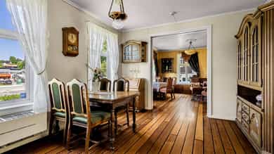 Underetasje Boder To romslige og praktiske boder gir godt med oppbevaringsplass for alt fra sesongutstyr til hverdagsting – perfekt for et ryddig hjem. 1. etasje Gang og trapperom Velkommen inn i en romslig og funksjonell gang med god plass til yttertøy og sko. Doble inngangsdører gir et flott førsteinntrykk og slipper inn rikelig med dagslys. Fra gangen fører en trapp deg videre opp til andre etasje. Kjøkken Hyggelig kjøkken med klassiske profilerte fronter og slitesterk laminatbenkeplate. Her er det plass til alt du trenger av hvitevarer – inkludert kjøleskap, komfyr, platetopp, oppvaskmaskin og ventilator. Ved vinduet er det rom for spisebord – et perfekt sted for frokosten, mens den sjarmerende grua gir en ekstra lun stemning. Bad Praktisk bad med fliser på gulv og vegger kledd med våtromstapet. Rommet er innredet med nedfelt servant, toalett og dusjkabinett. Badet har tilgang både fra kjøkkenet og vaskerommet, noe som gir god flyt i hverdagen. Vaskerom Lyst og funksjonelt vaskerom med belegg på gulvet og våtromstapet på veggene. Her finner du utslagsvask og opplegg for vaskemaskin. I tillegg har rommet egen utgang til hagen – ideelt for praktisk bruk i en travel hverdag. Stuer Denne etasjen byr på hele tre ulike stuer, noe som gir stor fleksibilitet til både små og store behov – enten du ønsker TV-stue, bibliotek, lekerom eller selskapsrom. I én av stuene finner du en vakker klebersteinsovn som både varmer godt og skaper en lun og koselig atmosfære. 2. etasje Gang Lys og praktisk gang som knytter etasjens rom sammen på en naturlig måte. Soverom Her finner du tre romslige soverom, alle med plass til både seng, skrivepult og oppbevaring. To av rommene har garderobeløsning, mens det tredje har god plass til skap eller kommode. Bad Badet har belegg på gulvet og vegger kledd i våtromstapet. Det er innredet med servant, badekar og toalett – perfekt for både en rask dusj eller et avslappende bad. Stue I loftsetasjen finner du en koselig og innbydende stue – et perfekt sted for avslapning og hygge. Her er det god plass til både sofagruppe, TV-møbler og oppbevaring. Rommets lune atmosfære gjør det til et naturlig samlingspunkt for rolige kvelder eller en egen sone for barna eller gjester. Bod Ekstra oppbevaringsplass finner du i boden – ideell for lagring av klær, sengetøy eller andre ting du ikke bruker til daglig. Diverse Taktekking med glaserte teglstein – både vakkert og holdbart Takrenner og nedløp i metall Luft-til-luft varmepumpe for komfortabel varme Naturlig ventilasjon som sikrer et godt inneklima
