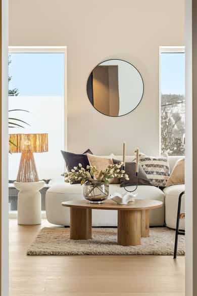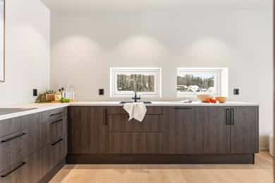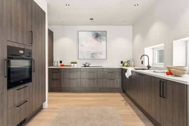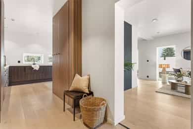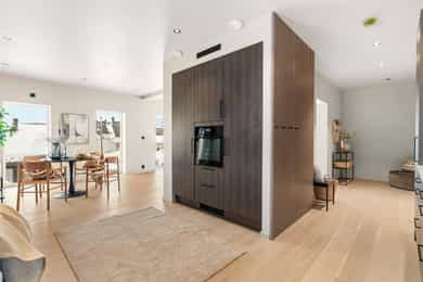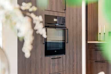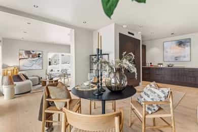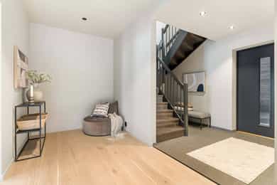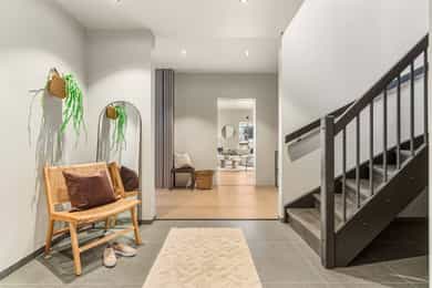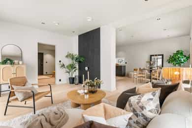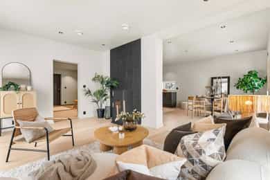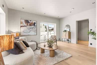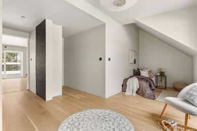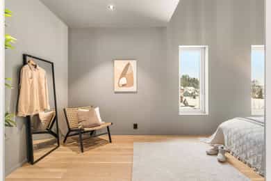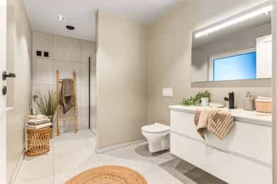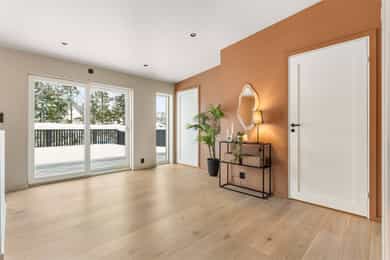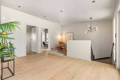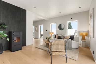 Entré Adkomst fra svalgang og inn i en innbydende entré, med flislagt gulv. Lekker sort trapp opp til 2.etasjen. Gang og hall med god plass med adkomst til kjøkken og stue. Både entré og hall har god plass til entrémøbler og ønskede garderobeløsninger. Stue Superfin stuedel i vinkel med gjennomgang fra gangen som tar deg gjennom, stue, spisestue, kjøkken og tilbake til gangen. Lyse fargevalg og slette overflater. Gode møblerings muligheter i ulike soner med flere møbelgrupper. Ildsted med peisovn som installeres før overtagelse. Fra stuedelen er det utgang via skyvedør til romslig markterrasse. Store gode vindusflater i flere himmelretninger gir godt med naturlig lysinnslipp. Downlights i himlingene og det er godt med kontakter/stikk på vegger. Koselig liten stuedel i 2.etasje med ulike innrednings muligheter og utgang til stor takterrasse. Kjøkken Stort, lekkert og sosialt kjøkken i husets første etasje. Innredning i en lun nøttebrun farge med laminerte skrog og slette fronter. Frontene har imitert trestruktur. Lys laminert benkeplate med nedfelt sort oppvaskkum i komposittmateriale. Bak spilene skjuler det seg egen matbod. I hovedsak underskap/skuffer med meget god oppbevaringsplass. Det er integrert stekeovn, kjøleskap, fruseskap, koketopp og oppvaskmaskin. Åpen løsning til spisestue og stue i vinkel. Ventilator er integrert i koketoppen. Gjennomgånde sorte detaljer på kran, oppvasskum, håndtak på fronter og kontaktstikk. Kjøkkenet er godt lyssatt med downlights i himlingen. Nett kjøkken i gjestehus med laminert innredning, slette fronter og laminert benkeplate. Oppvaskkum i metall, med sort kran/blandebatteri. Integrert stekeovn og ventilator. Bad, wc og vaskerom Lekkert bad i 1.etasje med flislagt gulv, fliser i dusjsone/dusjnisje og eller slette veggflater og slette himlinger med downlights. Glassvegg inn til dusjnisje med regnfallsdusj. Opplegg for vaskemaskin og eventuelt tørketrommel. Lys og stilren innredning med heltrukket servant, underskap med to skuffer. Tilhørende speil med integrert belysning. Vegghengt toalett. Det er varme i gulv, mekanisk avtrekk og tilluft via dør. Fresht bad i 2.etasje med flislagt gulv, slette vegger malt i en livlig farge. Fliser i dusjsonen, innfellbare dusjvegger for god plass besparelse. Plassrik todelt innredning. Innredning med heltrukket servant og underskuffer, tilhørende sideskap med god oppbevaringsplass. Tilhørende speil med belysning. Vegghengt toalett. Godt lyssetting med downlights i himlingen. Varme i gulvet, mekanisk avtrekk og tilluft via dør. Bad i gjesthus er lyst og moderne med tidløse material og fargevalg. Flislagt gulv og dusjsone, ellers slette overflater. Dusjhjørne med innfellbare dusjdører, regnfallsdusj. Gulvmontert toalett. Lys innredning med heltrukket servant og skuffer for oppbevaring. Det er opplegg for vaskemaskin, varme i gulvet og mekanisk avtrekk. Soverom Boligen har totalt tre soverom, alle beliggende i husets 2.etasje. Generøse i størrelse, to av rommene har garderobeløsning/walk-in closet. Hovedsoverom med ekstra god takhøyde. Et av soverommene har utgang til balkong. Lyse og slette overflater med fine møbleringsalternativer til soveroms møblement. Lagring Utvendig bod/teknisk rom til lagring. Det er matbod på kjøkken. Mulighet for lagring i grovkjeller med adkomst via elektrisk luke i kjøkkengulv. Tekniske installasjoner Synlige vannrør i plast, rør i rør. Hovedstoppekran er plassert i teknisk rom/bod. Synlige avløpsrør i plast. Varmtvannsbereder på ca. 180 liters kapasitet med el-kassett for gulvvarme. Vannbåren varme via el-kolbe i bereder er plassert på bod/teknisk rom. Boligen har balansert ventilasjon. Elektrisk anlegg med automatsikringer og i hovedsak skjult ledningsnett. Generelle materialvalg Innvendige himlinger og vegger med malte glatte flater. Gulv med parkett, fliser og støpt gulv i kjeller. Trapper av treverk mellom etasjene. Innvendige glatte/slette dører. _______________________________ Det er i forbindelse med salget utarbeidet en tilstandsrapport fra bygningssakkyndig. Tilstandsrapporten er en teknisk gjennomgang av boligen med oppdagede avvik. Forhold som har fått TG2 og TG3 må gjennomgås spesielt nøye, da disse indikerer avvik fra normal slitasje og/eller høy alder, med mulig behov for utbedring. Bygningsdeler som har fått TGIU er ikke undersøkt av takstmann. Bygningsdeler som har fått TG2: - Innvendig > Etasjeskille/gulv mot grunn Avvik: Deler av etasjeskiller er skjult og har en alder som øker sannsynligheten for fuktskader. Bygningsdelene har oppnådd mye av sin forventede funksjonstid. Bjelkelag over krypkjelleren/blindkjelleren er en risikokonstruksjon. Denne konstruksjonen har høy skadefrekvens. Det er økt risiko for skjulte skader som ikke kan avdekkes uten bygningsmessige inngrep. - Innvendig > Radon Avvik: Det er ikke foretatt radonmålinger, og bygget er heller ikke utført med radonsperre. I henhold til radonkartet vises aktsomhetsgrad: Moderat til lav. Risikoen vurderes som begrenset, men radon kan forekomme lokalt. - Innvendig > Rom Under Terreng Avvik: Deler av bygningsdelene er skjult og har en alder som øker sannsynligheten for skjulte feil/skader. Tilstandsgrad gitt pga. nevnte forhold. - Innvendig > Krypkjeller Avvik: Krypekjeller/blindrom er ikke inspisert. Adkomst ikke mulig. - Tomteforhold > Grunnmur og fundamenter Avvik: Store deler av grunnmur og fundamentering er fra byggeår. Eldre betong kan ha redusert kvalitet. Store deler av grunnmur/fumdamenter er skjult, da kun en mindre del under kjøkken har kjeller. Bygningsdeler som har fått TG3: - Ingen. Bygningsdeler som ikke er undersøkt (TGIU): - Utvendig > Balkonger, terrasser og rom under balkonger Avvik: Balkonger/terrasse er snødekt og derfor ikke nærmere vurdert. - Tomteforhold > Terrengforhold Avvik: Tomten er snødekt og derfor ikke nærmere vurdert.