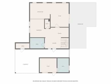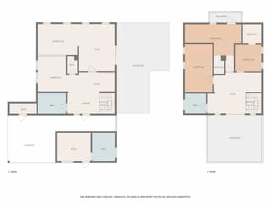 1.etasje Entré/hall, gang, kjøkken, spisestue, stue og bad. Utebod. Markterrasse. Tilbygg med carport og gjestehus 2.etasje Gang, bad, 3 soverom, walk-in closet og garderobe. Takterrasse og balkong. Grovkjeller