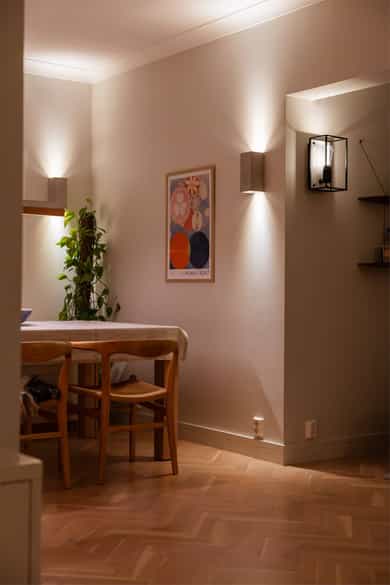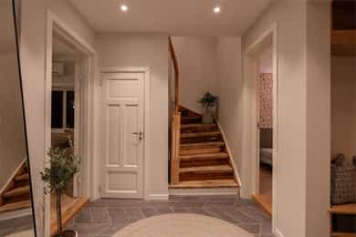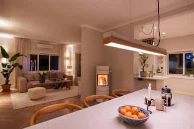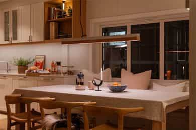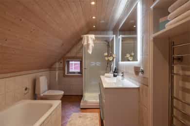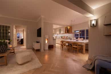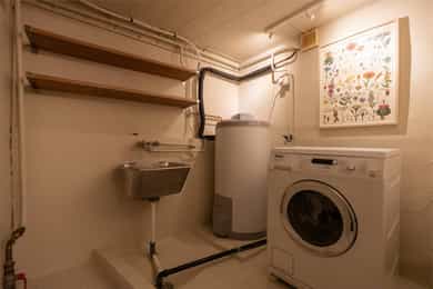 Stue Stue med store vindusflater som gjør hovedetasjen lys og luftig. Flott utsikt fra stuen. Karnappet fungerer som en lounge og gjør at stuen har flere fine innredningssoner. Åpen løsning mot kjøkken og spisestue med lekker peisovn mellom rommene. God plass til langbord i spisestuen. Kjøkken Herskaplig kjøkken med åpen løsning mot spisestue. Lekker innredning fra 2017 med glatte fronter og benkeplate i stein. Frontene er spesialbygget av en møbelsnekker. Stilig og eksklusive håndtak og lampe fra Buster And Punch. Kjøkkenet er godt utstyrt med platetopp, stekeovn, oppvaskmaskin og kjøle/fryseskap. Videre har kjøkkenet er lekkasjesikring med waterguard under vask og komfyrvakt over platetoppen. Bad Stort og flott familiebad i 2. etasje med både dusj, badekar og servant. Rommet har skap med glatte fronter og nedfelt servant fra 2014. Videre har rommet downlights i himling og varmekabler i gulv. Soverom Flott soveromsavdeling i 2. etasje med tre soverom med god størrelse og et romslig familiebad. Fantastisk utsikt fra hovedsoverommet. Soverom også i 1. etasje tilknyttet entré som kan fungere som et fint kontor eller gjesterom om nødvendig. Entré Innbydende og romslig entré med flislagt gulv og downlights i himling. God plass til garderobeløsning. Gjestetoalett Praktisk toalett tilknyttet entré med vegghengt toalett og servant med speil over. Kjeller I kjelleretasjen finner man et vaskerom med utslagsvask og opplegg for vaskemaskin og tørketrommel. Gulvareal i kjeller på gulvareal på 34 kvm. Overflater 1. etasje: Gulv: Parkett. Vegger: Sparklet/pussede og malte overflater. Himling: Sparklet/pussede og malte overflater. 2. etasje Gulv: Tregulv. Vegger: Panel og sparklet/pussede og malte overflater. Himling: Panel og sparklet/pussede og malte overflater. Kjeller: Gulv: Parkett. Vegger: Sparklet/pussede og malte overflater. Himling: Sparklet/pussede og malte overflater.