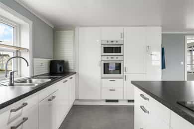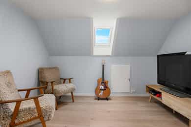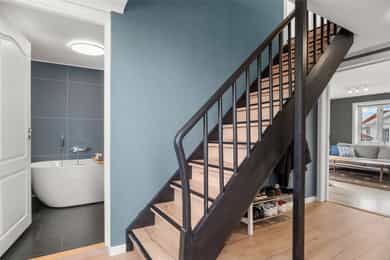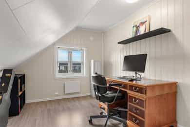 Boligen er hovedsakelig innvendig innredet med gulv av laminat. Veggene har tapet og malte plater. Innvendige tak har malte plater og himlingsplater. Boligen har betonggulv mot grunnen og etasjeskiller er i tre. Boligen har mursteinspipe med nytt røykrør, vedovn og sotluke/feieluke. Eier opplyser at det er satt inn nytt røykrør i pipe. Boligen har malt tretrapp mellom etasjene. S T U E Innbydende og kjekk stue med pene overflater. Her har en flere møbleringsmuligheter, og god plass til sittegruppe m/tv-benk. Gode vindusflater som gir godt med naturlig lysinnslipp, samt utgang til herlig terrasse på Ca. 14 kvm mot sør. Vedfyr og varmepumpe sikrer deg en behagelig innetemperatur på de ekstra kalde dagene. K J Ø K K E N Kjøkkenet (2012). Kjøkkenet har innredning med glatte fronter. Benkeplaten er av laminat. Det er integrerte hvitevarer som kjøl/fryseskap, oppvaskmaskin, micro og stekeovn. Det er kjøkkenventilator med avtrekk ut. Her har en god skap- og benkeplass til det kjøkkenutstyret en skulle trenge. God plass til spisegruppe. B A D + V A S K E R O M Bad: Pent bad i 2.etg med baderomsplater på vegg og vinylbelegg på gulv. Inneholder innredning m/servant, gulvstående toalett og dusjkabinett. Vaskerom: Tiltalende vaskerom/bad med veggplater på vegg og vinylbelegg på gulv. Inneholder innredning m/nedfelt servant, toalett, bade kar og opplegg/plass til vaskemaskin. Varmekabler i gulv. S O V E R O M Boligen har 4 gode soverom i boligens øverste etasje. Alle soverommene er av god størrelse og har plass til bl.a. seng, nattbord, skrivepult m.m. 1 soverom har takvindu med for lite dagslysflate ref. tilstandsrapporten. Det er også innredet og tatt i bruk ett soverom på hovedplan av god størrelse - Rommet er godkjent som garderobe iflg byggtegningene. E N T R E Her ønskes en velkommen av tidsriktige fargevalg og praktisk plass under trapperom til å henge fra seg yttertøy og plassere sine sko. El-tavle er lokalisert her. Videre adkomst til gang med trapp til øvre etasje. T E R R A S S E Flott terrasse mot sør med gode solforhold og møbleringsmuligheter. Her har en trapp som leder til lettstelt og pen hage mot vest og nord. Kjekk lekehytte for store og små. T E K N I S K E I N S T A L L A S J O N E R Innvendige vannledninger er av plast (rør i rør). Det er avløpsrør av plast. Boligen har naturlig ventilasjon. Boligen har installert en varmepumpe. Innedelen på varmepumpen er plassert i stue (Toshiba og er av eldre dato). Det er montert varmtvannstank i kjeller. Den er fra 2015 og er på ca. 200 liter (Oso). Det er sikringsskap med automatsikringer og jordfeilbryter. Det er monter AMS måler i 2017. Det foreligger samsvarserklæring på denne. Det er montert el-bil lader i 2023. Det er montert brannvarslere, brannslukkingsapparat og brannslange i boligen.