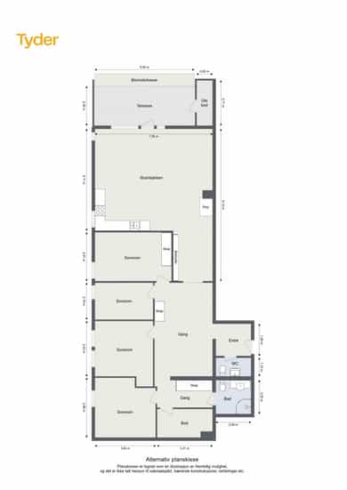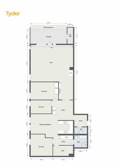 Leiligheten ligger en trapp ned fra inngangspartiet og inneholder: Bad, Wc, Entré, To ganger, Stue, Spisestue/kjøkken, Tre soverom og Bod Leiligheten disponerer én bod i garasjekjeller på ca. 2 m² samt utebod på ca. 3 m². Entré: Velkommen inn! I leiligheten blir du møtt av en flott entré med trestavs parkettgulv og lysmalte flater. I entréen er det god plass til å sette fra seg sko og henge fra seg yttertøy. Stue: Svært romslig og luftig stue med store vindusflater på to sider, som sørger for godt med naturlig lys. Her er det plass til sittegrupper og øvrig møblement. Rommet har en hyggelig peis som gir varme og en lun atmosfære. Terrasse: Fra stuen er det utgang til en solrik terrasse på ca. 14 m². Terrassen har flislagt dekke og plass til utemøbler og beplantning. På terrassen er det også tilgang til en praktisk bod på ca. 3 m². Spisestue/kjøkken: Spisestue og kjøkken ligger samlet i ett rom med god plass til både spisebord og kjøkkeninnredning. Kjøkkenet er innredet med glatte fronter og heltre benkeplate med nedfelt oppvaskkum i rustfritt stål. Det er fliser på vegg over benkeskap samt belysning under overskap. Ventilator og opplegg for oppvaskmaskin. Bad: Pent flislagt bad fra 2006. Badet er utstyrt med dusj med innfellbare glassdører, gulvstående toalett og servant med tilhørende baderomsinnredning. Rommet har varmekabler i gulvet. Det er opplegg for vaskemaskin i gang mellom kjøkken og bad. Wc-rom: Praktisk separat toalettrom bestående av servant, gulvstående toalett og benkeskap med glatte fronter. Det er speil og belysning over servanten. Hovedsoverom: Hovedsoverommet er romslig og har plass til dobbeltseng og garderobeløsning. Soverom II og III: De to andre soverommene er også av god størrelse og egner seg godt som barnerom, gjesterom eller kontor. Innvendig bod: Innvendig bod gir gode oppbevaringsmuligheter for blant annet klær, sportsutstyr og husholdningsartikler. Ekstern bod og garasjeplass: Leiligheten disponerer en ekstern bod i garasjeanlegget på ca. 2 m². Leiligheten disponerer garasjeplass for én bil i felles garasjeanlegg.