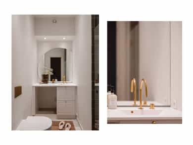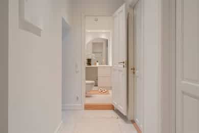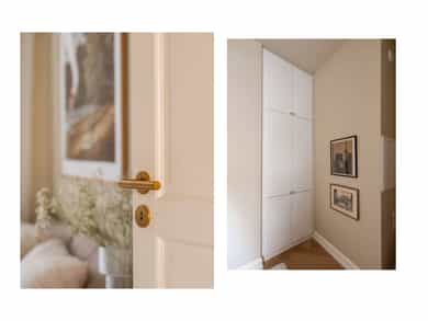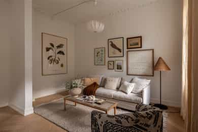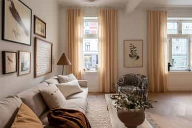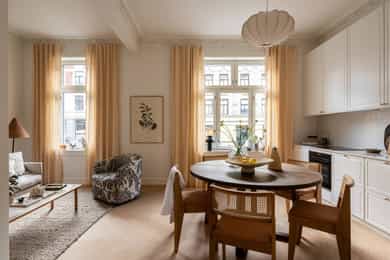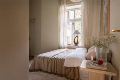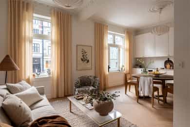 GANG Leilighetens inngangsparti er lyst og innbydende. Praktisk med gulvvarme og delikate 60x60 fliser på gulv fra Flisekompaniet. Tidligere døråpning er smart utnyttet med stand slik at man kan henge opp ytterjakker. Det kan være smart å lage hyller nedover til oppbevaring av sko og/eller eventuelt sette inn skoskap. Inngang til alle rom fra gangen. Enkel adkomst til leiligheten med en liten trapp opp. Sikringsskap med automatsikringer. Hele det elektriske anlegget er nytt i 2025. Gulvvarme. Det er satt inn ekstra høye dører mellom rommene for å gi et eksklusivt preg og matche den gode takhøyden på rundt 3 meter. Klassiske, profilerte dører i klassisk stil. Helt nye i 2025. STUE OG KJØKKEN Utrolig lys og hyggelig stue med gode møbleringsmuligheter for sofagruppe, TV og spisestue. To store vinduer gir godt med innslipp av naturlig lys. Pen fiskebeinsparkett fra "North Wood" på gulv og helt nye overflater. Generøs takhøyde på opp til ca. 3,06 m. Åpen løsning mellom stue og kjøkken, noe som er både sosialt og praktisk. Vakre klassiske detaljer som rosetter i tak gir rommet særpreg. I tillegg har man gått for en elegant og klassisk kjøkkeninnredning fra KVIK som står i stil til de klassiske detaljene. Kjøkkeninnredningen er helt ny og ubrukt. Kjøkkeninnredning fra 2025 med fronter i klassisk stil med håndtak i polert gull fra LoveHandles. Vakker kompositt benkeplate som er en type steinkompositt. Underlimt kum i messing. Videre har man integrerte hvitevarer - Stekeovn, platetopp, oppvaskmaskin og kombiskap (kjøl/frys). Aquastop/lekkasjevarsler med sensorer og magnetventil er installert. SOVEROM I OG SOVEROM II Leiligheten har to soverom som begge vender mot indre gårdsrom. Soverom I har god plass til dobbeltseng, nattbord og skap. Mulighet for å sette inn flere skap og tilpassede hyller hvis man ønsker det. Stort vindu mot indre gård. Soverom II har også plass til dobbeltseng og skap. NB - Legg merke til at rommet er 2,03 bredt så man kan fint ha en vanlig seng på tvers. Alle overflater er nye i 2025. BAD Et meget delikat og nyoppusset bad med gjennomtenkte løsninger. Badet har høy standard og gjennomtenkte løsninger. Tidløse og pene fliser med detaljer i oksiderende messing fra Tapwell. Regnfallsdusj samt håndholdt dusjhode, også i Honey Gold fra Tapwell. Badet består av servant med underskap, vegghengt toalett og romslig dusjnisje. Opplegg og plass til vaskemaskin under servant. Skapdør i samme utførelse som baderomsinnredningen som kan festes på integrert vaskemaskin medfølger. Gulvvarme og downlights i tak. Dokumentasjon på all oppussing foreligger. Selger har aldri bebodd boligen, og selger har derfor ikke spesifikk kunnskap om den utover det som fremkommer i salgsoppgave og tilstandsrapport. Det kan derfor eksistere feil, skader eller andre forhold ved boligen som ikke er spesifikt opplyst i salgsoppgaven. Interessenter oppfordres til å undersøke boligen særlig grundig.