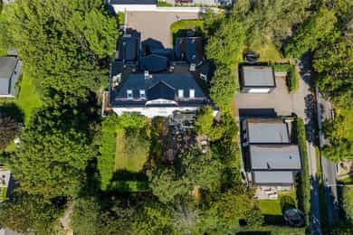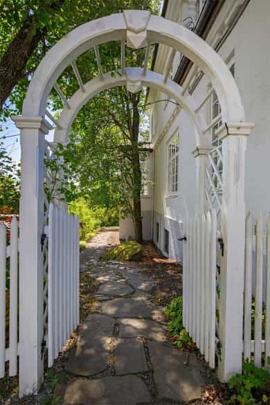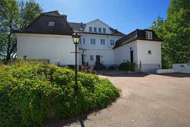 Eiendommen har en fantastisk beliggenhet godt skjermet fra veien, via en lang allé frem til gårdsplassen. Herskapsvillaen ligger flott plassert på tomten, omkranset av en herlig villahage med plen, furutrær, hekk og prydbusker.