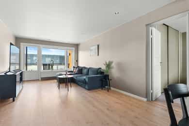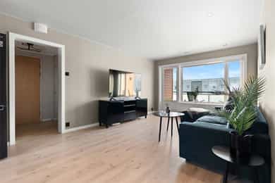 Entré: Velkommen inn! Leiligheten har en lys og innbydende entré, med plass til å henge fra seg yttertøy og sette fra seg sko. Det er montert dørcalling med åpner, så det er enkelt å slippe inn gjester fra bakkeplan! Stue: Stuen er av fin størrelse, med store vindusflater som slipper inn rikelig med naturlig lys fra begge ender av rommet! I stuen er det plass til sofaseksjon, tv-møbel og spisegruppe. I tillegg er det utgang til en hyggelig vestvendt balkong på 6 m². Her ute er det fint plass til utemøbler, samt gass-/elektrisk grill. Kjøkken: På kjøkkenet er plassen blitt godt utnyttet, og innredningen har rikelig med benk- og skapplass. Skapene har slette fronter, og det er montert nedfelt oppvaskkum og 1-greps blandebatteri i benkeplaten. Videre er det satt inn frittstående kjøle-/fryseskap, oppvaskmaskin og komfyr. Over komfyren er det tilkoblet ventilator. Bad: Boligen har et flislagt baderom med vannbåren gulvvarme. Innredningen består av servantskap med nedfelt servant, underskuffer og 1-greps blandebatteri. Videre er det dusjhjørne med glassdør, opplegg for vaskemaskin og vegghengt toalett. To soverom: Boligen har to soverom. Hovedsoverommet har plass til dobbeltseng med tilhørende nattbord. Videre er det plass til klesoppbevaring i stor skyvedørsgarderobe. Soverom nr. 2 fungerer ypperlig som barnerom, gjesterom eller kontor - her er mulighetene mange. Rommet har plass til seng, nattbord, garderobeløsning og evt. skrivebord. Innvendige overflater: Gulv: Fliser på bad. Laminat i øvrige rom. Vegger: Fliser på bad. Strie i entré. Malte slette flater i øvrige rom. Tak: Tak-ess i entré. Malte slette flater i øvrige rom. For full oversikt over tilstandsgrader, se punktet Byggemåte eller se vedlagt eierskifterapport.