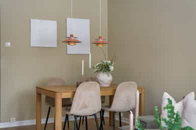 Velkommen til Mogata 11B! En flott 3-roms med god intern beliggenhet og flott standard. Hele boligen ble malt og fikk nye gulv i 2025. Den er smakfullt pusset opp med lyse og moderne farger som gir en god romfølelse og behagelig atmosfære. Entré Velkommen inn i denne lysmalte gangen med fliser og varmekabler i gulv. Gangen er romslig og har god plass til ønsket oppbevaringsmøblement. Kjøkken Moderne kjøkkeninnredning med glatte fronter og heltre benkeplate med nedfelt vaskekum. Godt utstyrt kjøkken med integrerte hvitevarer og waterguard. Stilige fliser i fiskebensmønster over benken. Her er det rikelig med skap- og benkeplass. Stue Lys stue med store vindusflater som gir rommet gode lysforhold. Stuen er malt i en moderne farge som fremstår lun og gir rommet en god romfølelse. Stuen har god plass til sofagruppe, tv-møblement og spisebord. Fra stuen er det utgang til en koselig sydvestvendt overbygget terrasse på ca. 10 kvm. Fra terrassen er det trapp ned til borettslagets fellesområde. Hovedsoverom Meget flott soverom malt i en lun grønnfarge og vegg-til-vegg teppe på gulv. Rommet har god plass til dobbeltseng, nattbord og har en moderne skyvedørsgarderobe med god pass til oppbevaring av klær. Teppet er teipet langs kanten og kan enkelt fjernes for å hente frem det originale tregulvet under. Soverom 2 Dette rommet passer fint som gjesterom, barnerom eller kontor. Rommet har god plass til seng, nattbord og har en praktisk skyvedørsgarderobe. Vegg-til-vegg teppet er teipet langs kanten og kan enkelt fjernes for å hente frem det originale tregulvet under. Bad Pent flislagt bad med elektrisk gulvvarme. Badet er opplyst å være fra 2016 ifølge tidligere salgsoppgave. Innredningen består av vegghengt toalett, servant med innredning, speil, dusjhjørne med svingbare glassdører, vaskemaskin og downlights. Elektrisk styrt vifte på vegg. Overflater Himling med malte plater. Vegger med malte plater og betong. Gulv med laminatfliser, laminat og vegg til vegg teppe.