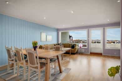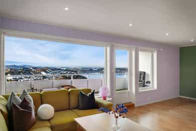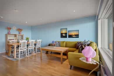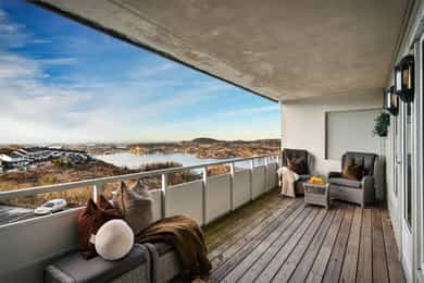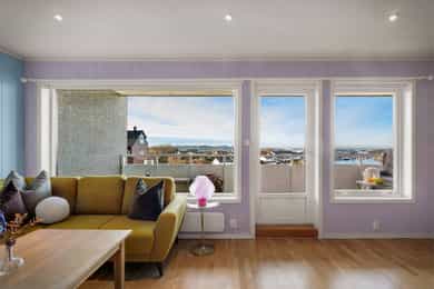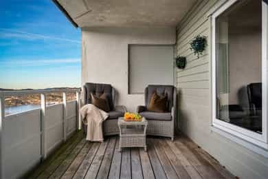 Innholdsrik 3(4)-roms leilighet med solrik balkong og sjøutsikt! Garasjeplass. Varmtvann, tv/internett m.m. inkl.