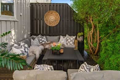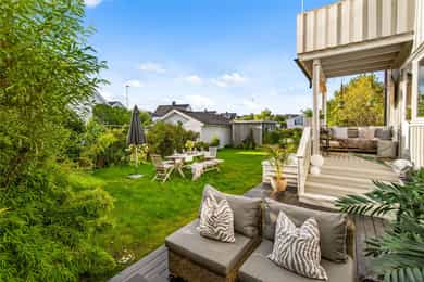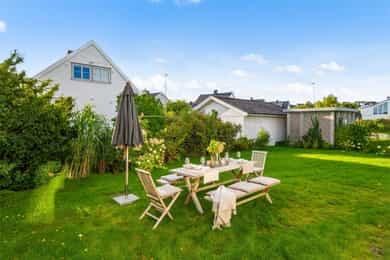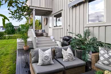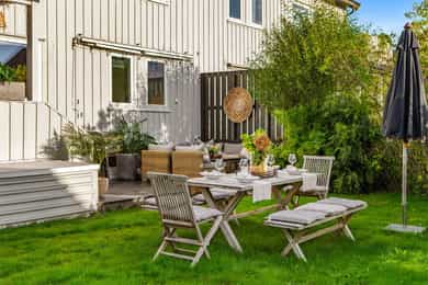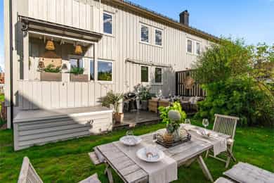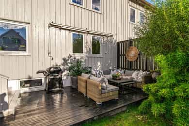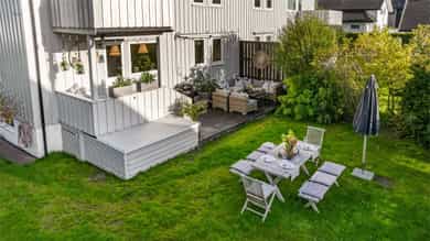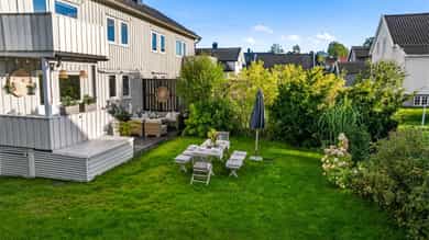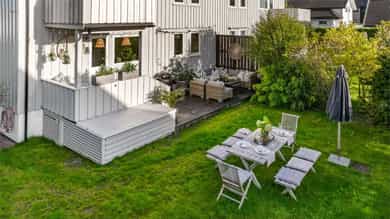 Leiligheten disponerer egen terrasse med utgang til hagen, som er et perfekt sted for rolige morgenstunder eller hyggelige måltider utendørs. Hagen byr ellers på svært gode solforhold, med flott ettermiddagssol i bakhagen, og danner et naturlig samlingspunkt for både familie og venner med god plass til lek, aktivitet og rekreasjon. Det er bl.a. flotte bærbusker i hagen.
