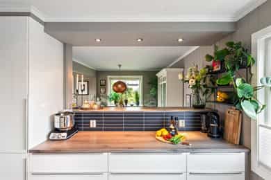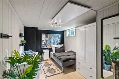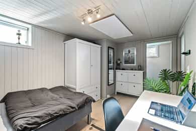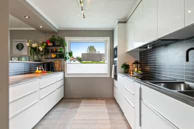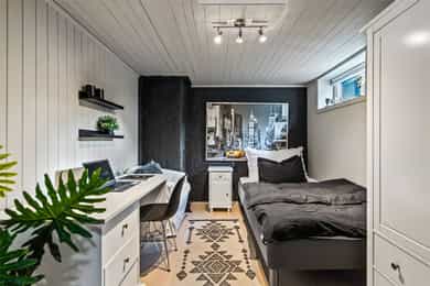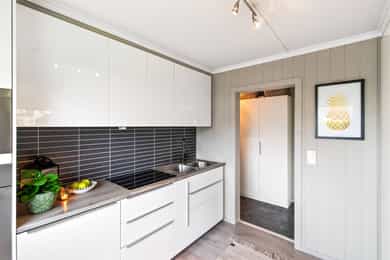 Integrerte hvitevarer medfølger i handelen. Vaskemaskin og kjøleskap i kjeller medfølger også.