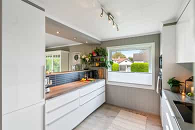 Lys og innbydende leilighet med flere oppgraderinger de senere år. Boligen fremstår som velholdt og moderne, med gjennomgående bruk av tidsriktige farger og materialvalg. Innvendig kan det blant annet nevnes nytt bad fra 2023 samt et pent kjøkken med god innredning fra 2014. Også byggets fasade og fellesarealer er tatt godt vare på gjennom borettslagets oppgraderinger de siste årene, med bl.a.: 2014/15 - Nye vinduer 2025 - Ny utvendig drenering 2017 - Felles trapperom oppusset Den generelle beskrivelse av boligens indre rom er som følger; Stue Romslig stue med vindusflater mot både vest og nord, som gir rikelig med dagslys. Her er det plass til både sofa- og spisegruppe, og midt i rommet finner du et hyggelig ildsted. Fra stuen er det direkte utgang til den vestvendte og svært koselige terrassen med trapp ned til hagen. Kjøkken Kjøkkenet ligger i åpen løsning til stuen. Innredningen, fra 2014, har rikelig med skap- og benkeplass, med lyse, slette fronter og benkeplate i harmonerende utførelse. Det er integrerte hvitevarer som komfyr, platetopp, oppvaskmaskin, microbølgeovn, samt kjøl- og fryseskap. Ventilator med avtrekk er plassert over koketoppen. Bad Stilrent bad renovert i 2023. Her er det lagt fliser på både gulv og vegger, og varmekabler gir behagelig varme året rundt. Rommet er utstyrt med moderne innredning med skuffer, servant, høyskap, vegghengt toalett samt dusjnisje med skyvedører. God ventilasjon via mekanisk avtrekk og vindu, som også sørger for naturlig lys. Soverom Leiligheten tilbyr i dag et romslig soverom med praktisk skyvedørsgarderobe. Planløsningen gir stor fleksibilitet, da rommet tidligere var delt i to soverom, noe som enkelt kan tilbakeføres. Det er også mulighet for å etablere et tredje soverom. Innvendige overflater Gulv: Laminat og fliser Vegger: Panel Himling: Takplater En pen og velholdt leilighet som er klar for innflytting! Tilstandsrapport for boligen er vedlagt salgsoppgaven. Se denne for nærmere informasjon om tilstandsgrad.