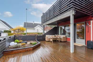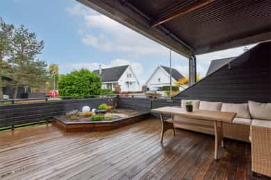 Selger opplyser at det er sol på terrassen fra ca. klokken 10 og frem til ca. 17-18. Kommer litt ann på hvor man sitter. Sol på kortsiden av huset resten av kvelden. (Plen)