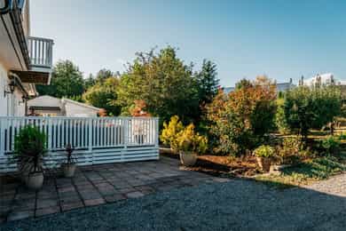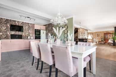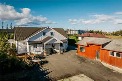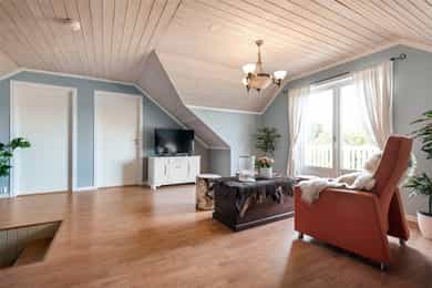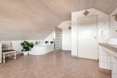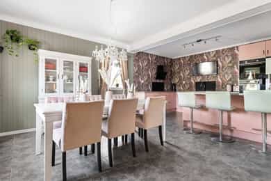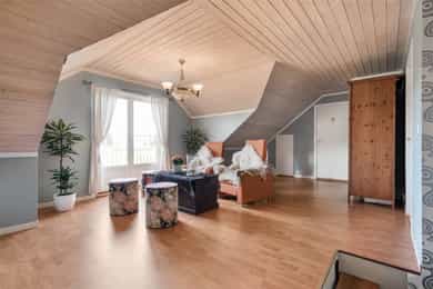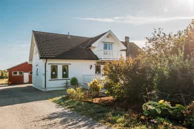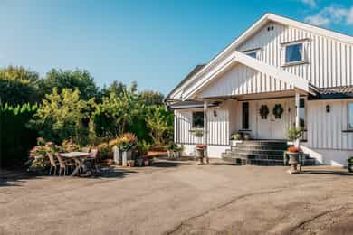 Velkommen til en guidet tur gjennom dette sentralt beliggende småbruket. Her er det mye som gir deg noe å trekke smilebåndet for. Vi starter ute med en helt idyllisk botanisk hage med et fuglbad som virkelig gir fuglene noe å dyppe nebbet i. Du har flotte stier og til og med en liten bru du kan sette deg på å dyppe tærne på varme dager. På baksiden av huset har du et romslig uthus der tingene dine kan stappes inn. Skal det bli fult her må du jobbe godt. Det er også på baksiden av huset du finner det 370kvm store drivhuset, har du ikke grønne fingrer her vil drivhuset føles en anelse stort, MEN her har du virkelig muligheten for å bli en gartner av rang. Tomten er på nesten 11 mål, med ca. 6800kvm til overflatdyrket mark. Så her er det masse plass å boltre seg på. Vi tar turen inn i huset. Her møtes du av en romslig gang med en bod til høyre og et vaskerom til venstre. I gangen har du en leken tapet som gir deg smil om fjeset. Den fine og sjarmerende dobbeltdøren tar deg inn i spisestuen, her åpner stua seg opp og du har plass til både familie og venner, og kanskje noen som kommer uanmeldt. For denne spisestua er meget romslig, dette gjelder også stua som ligger en venstresving unna. I stua har du fint plass til en romslig sofa, en eller 2 stoler og litt mer om du skulle ønske. Vi tar turen inn i det ROSA kjøkkenet som er en farge ikke alle hadde turt, men jeg må si, dette er så gjennomført og kult at man kan få hakeslepp. Her er det også en lekker tapet med kakadue på, det er så lekent at det NESTEN blir for mye. På kjøkkenet er det mer en god nok plass til et spisebord og noen solide stoler om det ønskes. Etter kjøkkenet tar vi turen opp i andre etasje, trappa er en moderne variant, dog uten rekkverk, så gå forsiktig. Når du kommer opp i stua oppe får du en romslig stue for barna, eller kanskje de voksene ender opp her, hvem vet! Her er innredningen pen og detaljrik, men har et litt mer nøytralt utgangspunkt. Soverommene her oppe er også romslige og med nok plass til både klær og skrivepult. Hovedsoverommet er enda litt større og her er det plass til det du har og litt til. Badet her oppe er av god størrelse og her er det både dusj og badekar. Det er rett å slett så romslig at her kan man danse rundt mens man pusser tennene, eller om man bare ønsker seg en liten svingom. Håper denne guidede turen har gitt deg et inntrykk av boligen. Velkommen til en ufattelig hyggelig visning blant blomster, jorder og kanskje akkurat din lille småbruksdrøm!