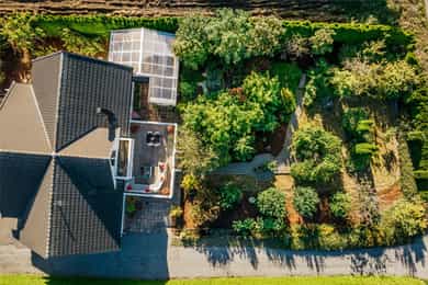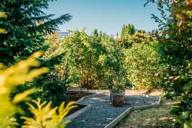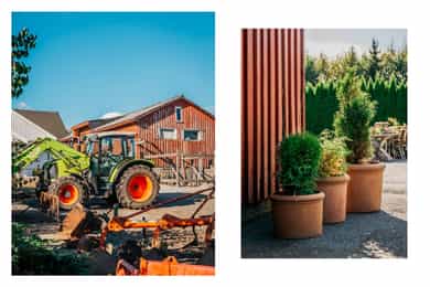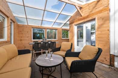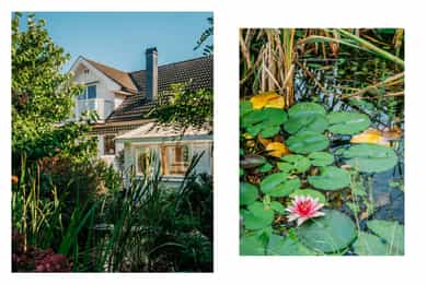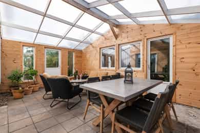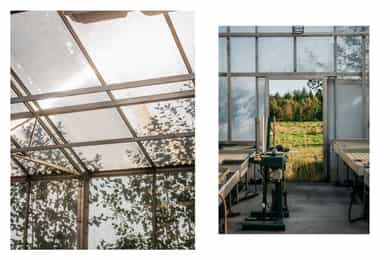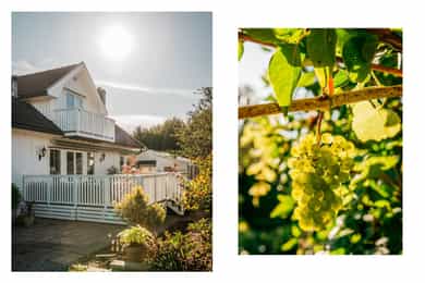 Den store hagen er beplantet med trær og busker som gir et frodig og lunt miljø. Ute finner du også en vinterhage/utestue og et sjeldent stort drivhus på hele 370 kvm – perfekt for deg som ønsker å dyrke, eksperimentere eller videreutvikle eiendommen.