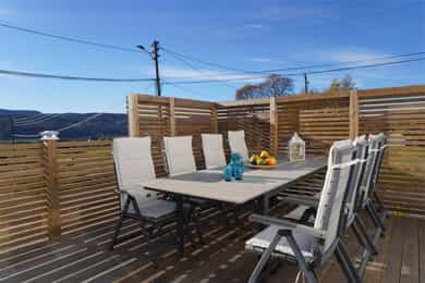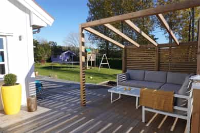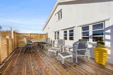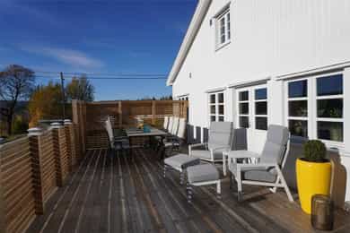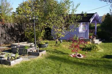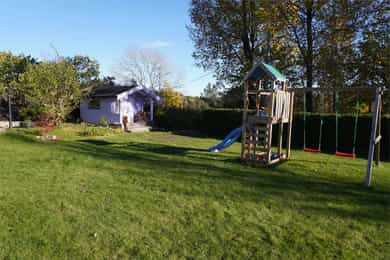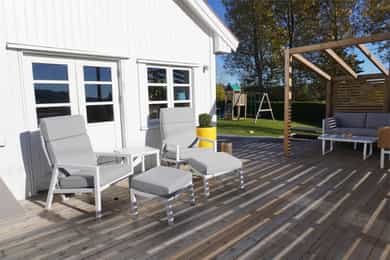 Videre har eiendommen nydelige uteområder med stor hage og terrasse. Hagen er opparbeidet med ulike beplantninger som trær, hekk og prydbusker. Det er også lagt til rette for en liten grønnsakshage/dyrking i hagen. Her er det god boltreplass for store og små, i trygge og landlige omgivelser. I hagen er det også plassert en lekestue, perfekt for barna.