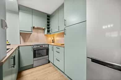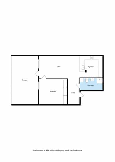 Entré: Lys og fin entré med plass for skap eller kommode til oppbevaring. Innfelte downlights i tak for god belysning. Stue: Leiligheten har en lys og fin stue med god plass til romslig sofagruppe og tilhørende tv-møblement. Stuen har fine overflater og store vindusflater som bidrar til godt med naturlig lys i oppholdsrommet. Det er plass for spisebord i tilknytning til kjøkkenet. Kjøkken: Pent og moderne kjøkken fra 2018 med glatte fronter og benkeplate i laminat. Kjøkkenet er utstyrt med hvitevarer som stekeovn, platetopp, oppvaskmaskin og frittstående kjøl/fryseskap. Soverom: Romslig soverom med god plass for dobbeltseng og tilhørende nattbord. Praktisk med innebygd garderobe som gir gode oppbevaringsmuligheter. Soverommet har malte vegger og vegg-til-vegg teppe på gulv. Bad: Pent flislagt bad som er pusset opp i 2018. Badet har flislagte overflater og varmekabler i gulv, samt utstyrt med heldekkende servant med underskap, servantskap, stor dusjnisje og toalett. Opplegg for vaskemaskin på badet.