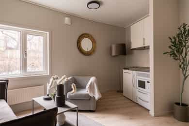 Moderne og arealeffektiv 1-roms leilighet med gode lysforhold fra store vindusflater. Omfattende nyoppusset i 2025 med blant annet nytt, lekkert bad/wc og nye overflater. Nytt røropplegg og oppgradert elektrisk anlegg. Kjøkkenkroken har en praktisk og plassbesparende løsning, og badet fremstår delikat med flislagte vegger og romslig dusjnisje. Entréen er praktisk utformet med god plass til garderobe og oppbevaring. Moderne felles allrom med lekkert kjøkken og utgang til felles balkong på hele 10m². I tillegg er det tilgang til felles takterrasse. Felleskostnadene inkluderer strøm (àkonto), fyring, varmtvann og internett. Ingen forkjøpsrett. Mulighet for garasjeleie. Svært sentralt og attraktivt område, likevel rolig og tilbaketrukket i indre gårdsrom midt på Bislett.