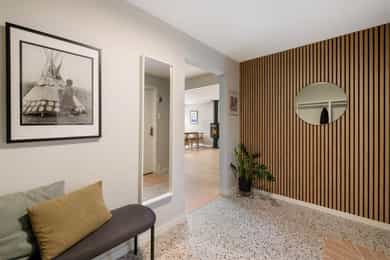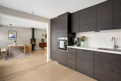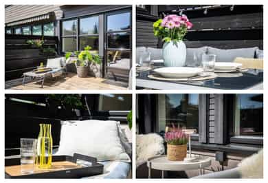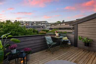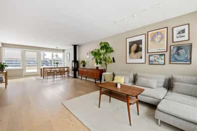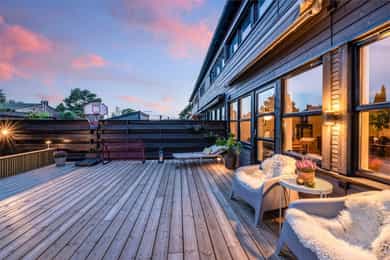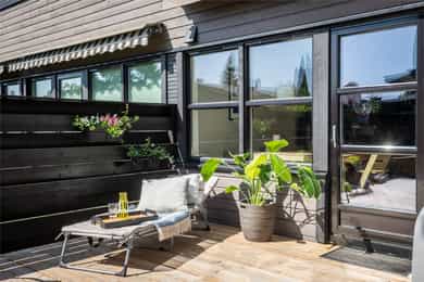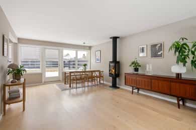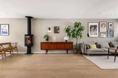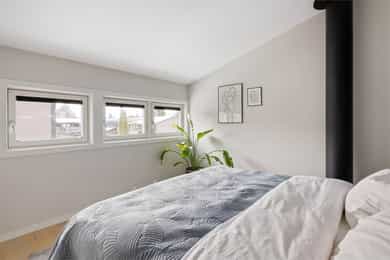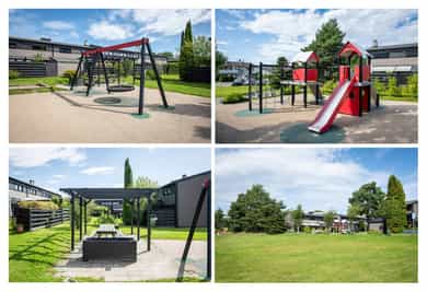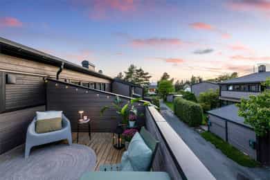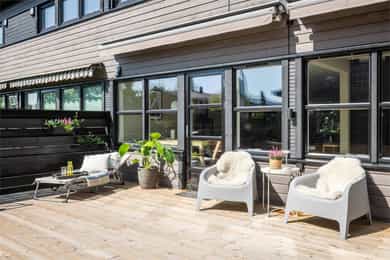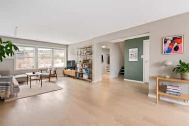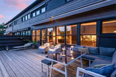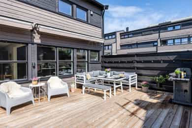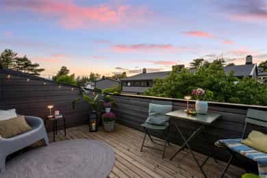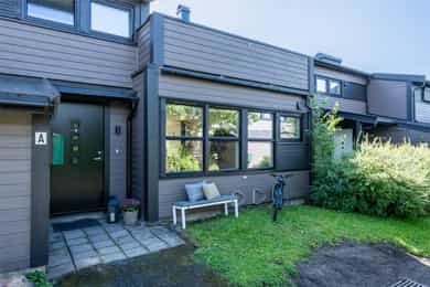 Strøkent og utbygget enderekkehus med solrike uteplasser | Garasjeplass m/ lader | Peis | Gulvareal 135 kvm | Bilfritt