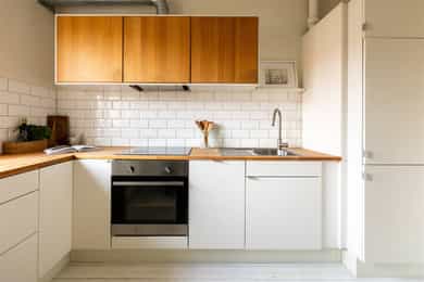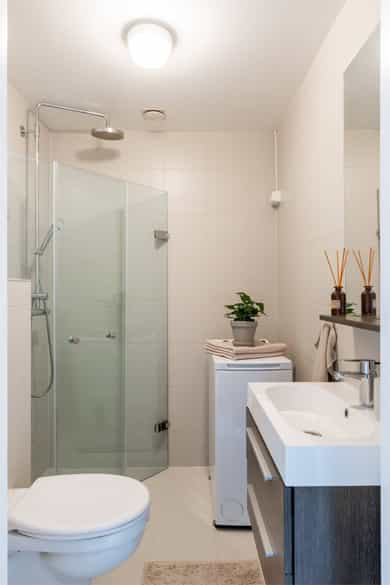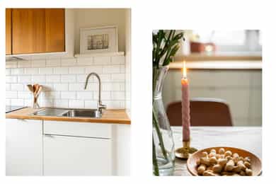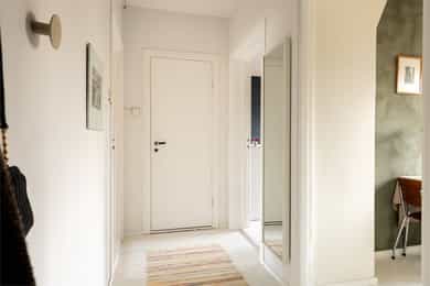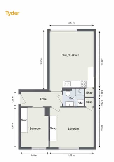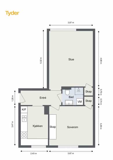 Entré Vel inne ankommer du en lys og innbydende entré med god plass til å henge fra seg yttertøy og sko. Veggene har praktiske kroker som gir fine muligheter for å henge fra seg jakker, vesker og skjerf. Et speil på veggen bidrar til å utnytte plassen godt og gir gangen en romsligere følelse. Fra entréen er det enkel og praktisk adkomst til alle rom i boligen. Kjøkken Kjøkkenet er lyst og innbydende, med en smart planløsning som utnytter plassen godt. Her finner du en moderne innredning med glatte fronter, heltre benkeplate og pene fliser over benken som gir et tidløst uttrykk. De store og dype vindusflater gir godt med naturlig lys og en hyggelig utsikt mens du lager mat. Kjøkkenet har integrerte hvitevarer som stekeovn, platetopp, oppvaskmaskin og kjøl/frys. Det er også plass til en liten spiseplass for hyggelige måltider. Tilsvarende leiligheter i borettslaget har flyttet kjøkkenet ut i stuen for å skape et ekstra soverom. Stue Stuen fremstår lys og romslig, med store vindusflater som slipper inn godt med dagslys og god takhøyde, som gir en behagelig romfølelse. Stuen har også fritt utsyn mot det hyggelige nærområdet. Rommet har god plass til både sofa, spisebord og TV-møbler, og den praktiske planløsningen gjør det enkelt å innrede etter behov. I tillegg har stuen et innvendig kott som gir godt med oppbevaringsplass. Soverom Soverommet er lunt og behagelig, malt i en behagelig blåfarge som skaper en rolig atmosfære. Det store vinduet gir godt med naturlig lys og en hyggelig utsikt mot nærområdet. Rommet har plass til dobbeltseng og øvrig møblering som kommode eller garderobeskap. I tillegg finnes det et praktisk kott som gir ekstra oppbevaringsplass. Bad Badet fremstår moderne og velholdt, og ble pusset opp i regi av borettslaget i 2000. Det er senere oppgradert med nye fliser og innredning i 2012. Innredningen består av et stilrent benkeskap med glatte fronter, samt speil og praktisk hylle over servanten. Rommet er utstyrt med dusjone med glassdører, vegghengt toalett og opplegg for vaskemaskin.