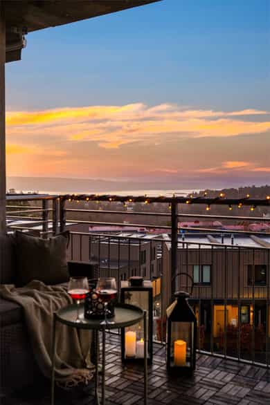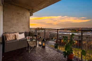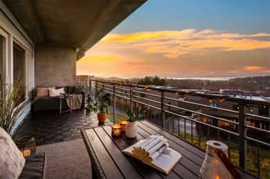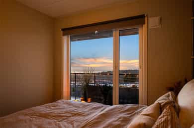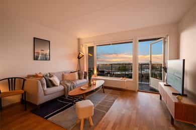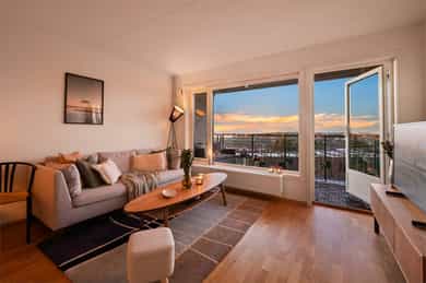 Lys og luftig 2-roms med 15m² nordvestvendt balkong, heisadkomst og parkeringsplass med el-lader. V.vann og fyring inkl.