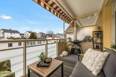 - SELGERS INTERVJU - Hva kommer dere til å savne med boligen/området? Vi kommer til å savne beliggenheten og nærheten til marka. Vi har hatt mange fine treningsturer opp på Grefsenkollen, samt mange fine turer i Lillomarka. Vi har fått fem fine år og skulle gjerne hatt flere om det ikke var for at vi skal ut av byen. Kort vei til butikker, restauranter og badeplasser, og kun en liten busstur ned til sentrum med veldig god kollektivdekning. Vi har hatt det så koselig med mye sosialt, spesielt ute på verandaen som har sol fra 12-13 og helt til ca 22. Veldig hyggelige naboer, og for oss har det vært en perfekt leilighet å etablere seg i, — vi er jo en mer når vi flytter ut. Hva er deres favoritturer i nabolaget? Du når Grefsenkollen på en halvtime dør til dør, så der har vi hatt mange treningsturer. Hatt mange fine turer i Lillomarka, spesielt til Årvollåsen, Trollvann, glassverket og Linderudkollen. Der kan du også ha trappeløp opp hoppbakken, og blir belønnet med veldig god utsikt på toppen. Det er flere markahytter med servering. Ellers har vi hatt mange fine trilleturer i området Årvoll/Tonsenhagen. Årvolldammen er ca 7 min spasertur, og der finner du en av svært få badeplasser i Oslo med blått flagg. Hvem er naboene? Her finner du mennesker i alle aldre. Både eldre og unge nyetablerte med og uten barn. Vi har fått flere vennskap vi tar med oss videre. Litt om nærområdet: Hyppige bussavganger, med god dekning generelt. 3 matbutikker, blomsterbutikk, apotek, frisør, tannlege, bibliotek, cafe og restauranter innen 3-5 min gange. 2 treningssentre i 3 min gange. Veldig mange barnehager i området, 3 stykker i 3 min gangavstand. Bademuligheter i Årvolldammen (7 min å gå) og isdammen. Flere skoler, nærmeste er nabo til borettslaget. - Leilighet beliggende i byggets 3. etasje. Det er adkomst via felles trappeoppgang. Oppgangen har porttelefon. Leiligheten inneholder entré, 2 soverom, kjøkken, bad og stue. ENTRÉ: Velkommen inn! Leiligheten har en innbydende entré som skaper et umiddelbart godt førsteinntrykk. LYS OG LUFTIG STUE M/UTGANG TIL BALKONG: Stuen er lys og luftig med store vindusflater som sørger for rikelig med innslipp av naturlig lys. Planløsningen åpner opp for flere møbleringsmuligheter med god plass til sofagruppe, TV-møbler og spisebord med tilhørende stoler. Gulvet er belagt med flott laminat, og overflatene er malt i delikate og moderne fargetoner. Et perfekt utgangspunkt for å innrede med egne møbler og gjenstander for å skape ditt drømmehjem. Fra stuen er det utgang til en herlig vestvendt overbygget balkong på ca. 9 m² med gode solforhold. I vår- og sommerhalvåret blir balkongen en naturlig forlengelse av stuen, perfekt for hyggelige stunder med familie og venner. Her kan du enkelt skape en koselig uteoase med utemøbler, beplantning og en gassgrill. KJØKKEN: Moderne kjøkken fra Kvik med gode arbeidsflater og rikelig med skapplass. Kjøkkeninnredningen har glatte fronter og laminat benkeplate med nedfelt oppvaskkum. Det er belysning over benkeplaten som gir gode arbeidsforhold. Kjøkkenet er utstyrt med integrert platetopp, stekeovn, oppvaskmaskin samt kjøle- og fryseskap. Over kokeplassen er det montert kullfilterventilator. Boligen er også utstyrt med waterguard og komfyrvakt. HOVEDSOVEROM: Soverommet er romslig, med plass til dobbeltseng, nattbord og tilhørende møbler. Rommet har også rikelig med oppbevaringsplass i et romslig garderobeskap. SOVEROM 2: Soverommet er romslig og har plass til både seng og øvrige møbler. Det er et allsidig rom som passer perfekt som barnerom, gjesterom eller hjemmekontor, tilpasset dine behov. I tillegg byr rommet på gode oppbevaringsmuligheter med garderobeskap. BADEROM: Delikat, flislagt baderom med elektrisk gulvvarme og downlights i himlingen. Badet ble lett overflateoppusset i 2024, med ny silikonering i dusjhjørnet samt montering av ny baderomsinnredning. Rommet er innredet med klosett, servant plassert på baderomsinnredning, speil med belysning samt dusjhjørne med svingbare glassdører. Det er opplegg for vaskemaskin. Badet har naturlig avtrekk. OPPBEVARING: Leiligheten disponerer en loftsbod med "gulvflate" målt til 9 m², samt en kjellerbod på ca. 5 m². Det gjøres særskilt oppmerksom på at bod som er medtatt som BRA-e og i totalt BRA ligger på fellesareal, men disponeres av denne leiligheten. ØVRIG INFORMASJON: Entrédør: Lyd- og brannklassifisert entrédør med kikkhull. Vinduer: Vinduer med 3-lags pressglass, produsert i 2025. Balkongdør: Balkongdør med 3-lags pressglass, produsert i 2025. Innerdører: Innvendig har boligen formpressede innerdører med speil. Overflater, etc.: Himlinger med malt betong. Vegger med malt betong. Gulv med laminat. Takhøyden ble målt i entré til 2,48 m og i stuen til 2,48 m. Ventilasjon: Naturlig oppdriftsventilasjon av boligen med lufteluker i vegg. Elektrisk anlegg: Sikringsskap med automatsikringer plassert i felles gang. Oppvarming: Boligen varmes opp av vannbåren varme tilknyttet radiatorer. Elektrisk gulvvarme på bad.
