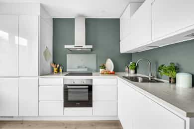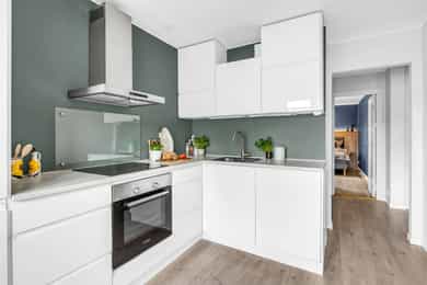 Integrerte hvitevarer medfølger, herunder oppvaskmaskin, komfyr, platetopp og kjøleskap.