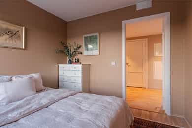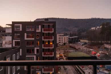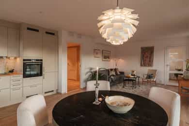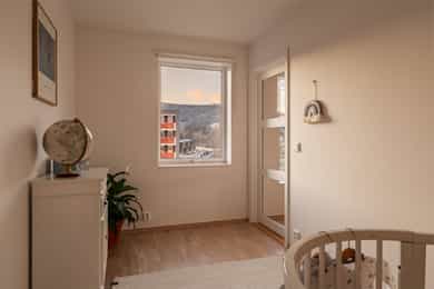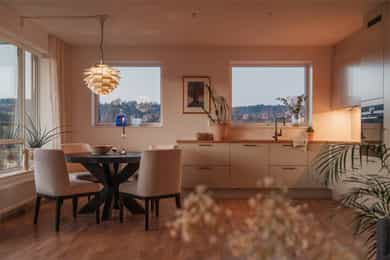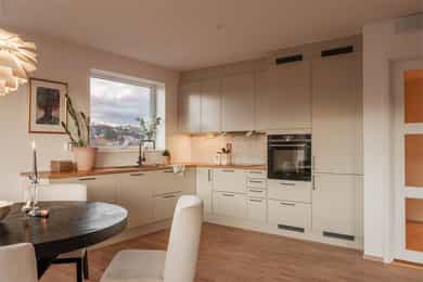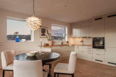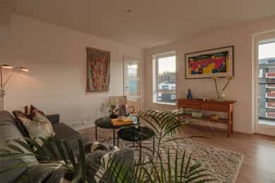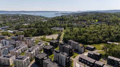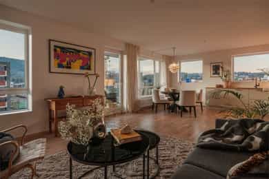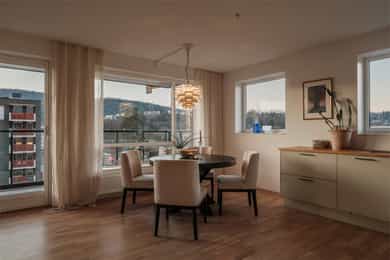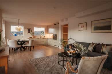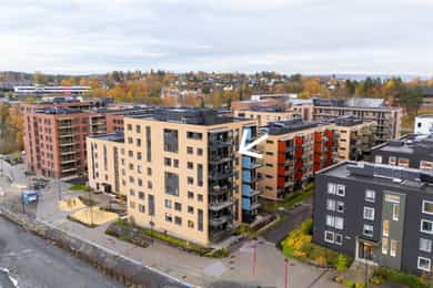 I barnevennlige og etterspurte omgivelser ligger det nå en lekker 4-roms hjørneleilighet og venter på nye eiere. Vestre Billingstad er idyllen der alt ligger til rette for «easy living», med god plass, heis direkte fra garasjen, standard fra 2022 med vannbåren varme og gjenværende garantitid. Utenfor døren venter grønne skogsturer langs Neselva, og en liten sykkeltur unna lokker fjorden. Kollektivtilbudet er prima både via buss og tog. Leiligheten ligger høyt på hjørnet av bygget i sjette etasje, med luftig stue, åpent kjøkken fra Marbodal og utgang til vestvendt balkong. Videre er det en hovedsuite med eget bad, to ytterligere soverom, et bad/wc/vaskerom og en pen entré med garderobe. Lagringsplass og garasjeplass med lader finnes i felles kjeller.