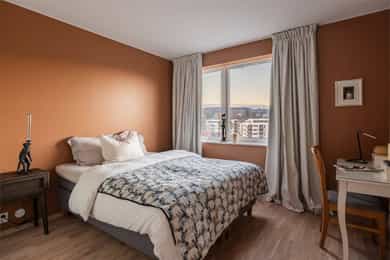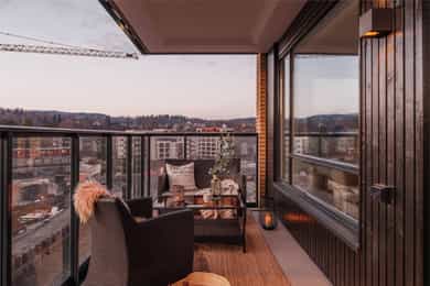 Moderne endeleilighet i 6. etg. m/vestvendt balkong, 3 sov., 2 bad, garasje m/lader og felles v.vann & oppvarming inkl