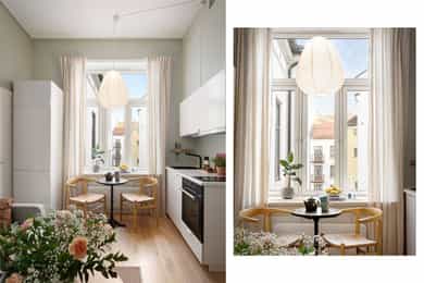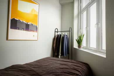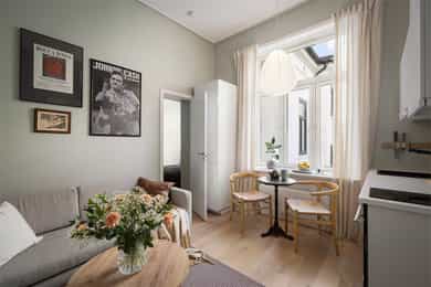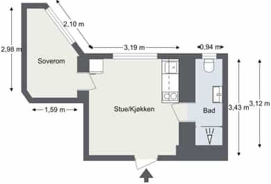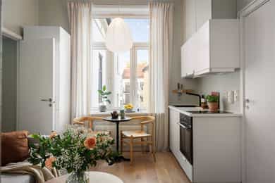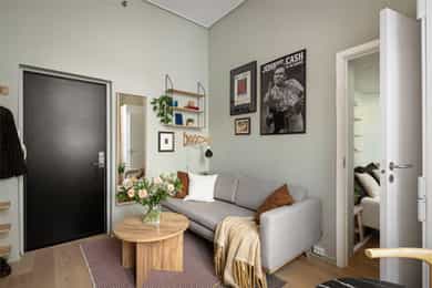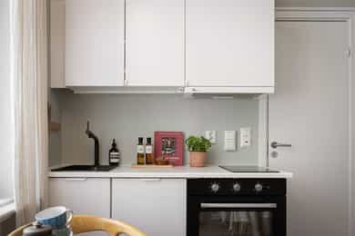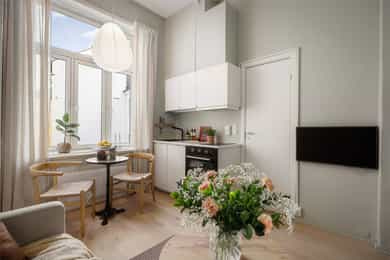 Entré: Åpen entré mot kjøkken og stue. Ved inngangsdøren er det plass til knagger og sko for oppbevaring av yttertøy. Åpen kjøkken- og stueløsning: Leiligheten har et arealeffektivt og moderne kjøkken med plass til det man trenger. Kjøkkenet er fra 2022, med glatte fronter, benkeplate i laminat og kum med ettgreps blandebatteri. Hvitevarene består av mekanisk vifte over integrert koketopp (to plater), integrert ovn, integrert kjøl/frys og integrert oppvaskmaskin. Det er avtrekk via mekanisk avtrekksanlegg i boenheten. God utnyttelse av plassen med alt man trenger av skap- og benkeplass. Ved kjøkkenet er det plass til spisebord. Leiligheten har en lys stue med store vindusflater og generøs takhøyde på hele 3,3 meter. I stuen er det plass til sofagruppe med tilhørende stuemøblement som bord og tv-benk. Den naturlige planløsningen gjør rommet enkelt å innrede. Velholdte og pene overflater med pen en-stavs parkett og lyse vegger. Soverom: Smart, arealeffektivt soverom med plass til seng. Plassbesparende, vegghengt skap sikrer godt med lagringsplass. Store vindusflater sikrer godt med lys og luft. Soverommet vender mot bakgård. Bad: Flott, tidløst bad fra 2005. Badet har flislagte overflater, gulvvarme og downlights i himling. Badet er utstyrt med veggmontert toalett, dusjsone med inn-utadslående dusjvegger og baderomsinnredning med skap, servant med ettgreps blandebatteri og vegghengt speilskap. Det er mekanisk avtrekk. Overflater: Gulv: En-stavs parkett og fliser på badet. Vegger: Malte veggoverflater og flislagte vegger på badet. Himling: Malte flater i himling. Takhøyden i stuen er oppmålt til 3,3 meter.