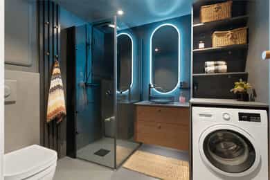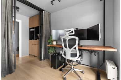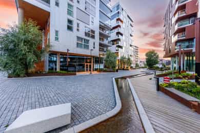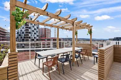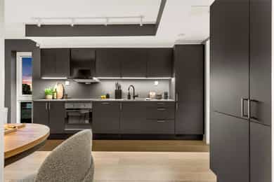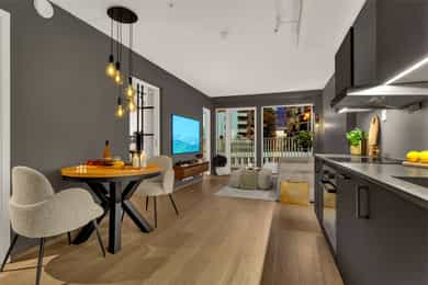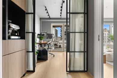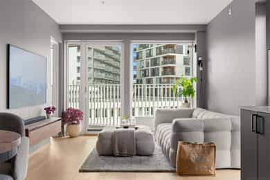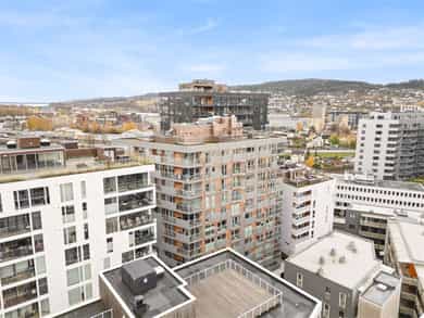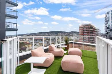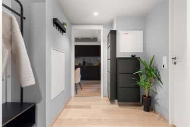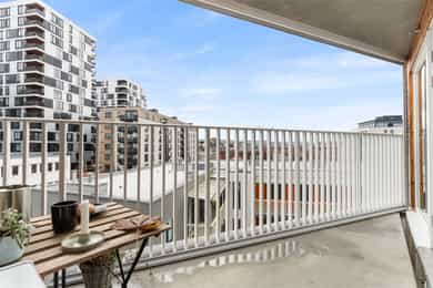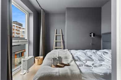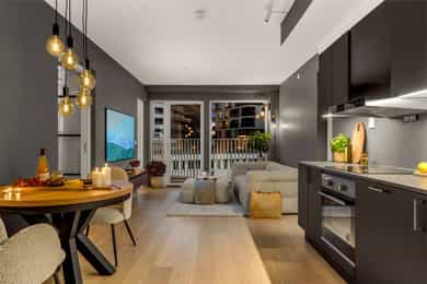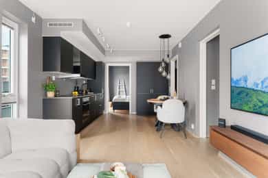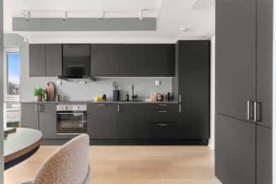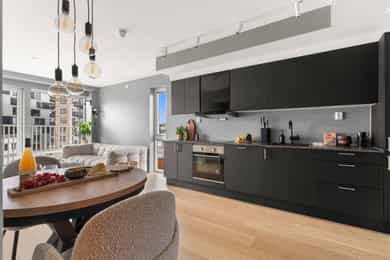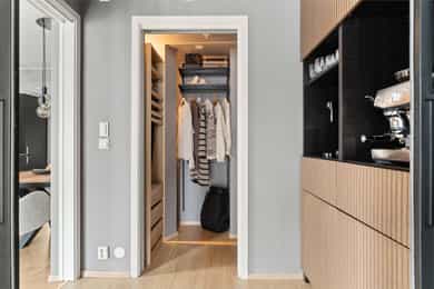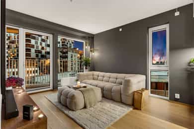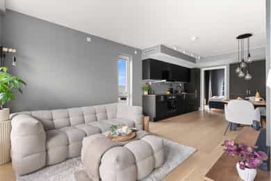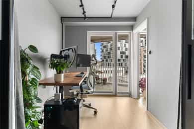 Entré Velkommen inn i en innbydende entré med god plass til oppbevaring. Her er det fastmontert skoskap og garderobeløsning som gir et ryddig førsteinntrykk. Veggene er malt i moderne farger, og det er gjennomgående 1-stavs parkett som setter tonen for resten av leiligheten. Stue Stuen er åpen, lys og luftig – perfekt for både avslapping og sosiale sammenkomster. Her er det plass til stor sofagruppe, TV-benk (fastmontert), samt spiseplass for flere. Store vindusflater slipper inn rikelig med naturlig lys, og utgangen til den sørvestvendte balkongen gir en sømløs overgang mellom inne og ute. Kjøkken Kjøkkenet er lekkert og moderne, med integrerte hvitevarer og god skapplass. Den åpne løsningen mot stue gir en sosial atmosfære – ideelt for deg som liker å lage mat mens du samtidig er en del av selskapet. Kjøkkenet er plassert slik at du får naturlig lys fra stuen og utgang til balkongen. Balkong Fra stue og kjøkken er det utgang til en sørvestvendt, overbygd balkong med deilige solforhold – her får du både dag- og kveldssol, og en nydelig solnedgang på sensommeren. Perfekt sted for avslapning etter jobb, med plass til både sittegruppe og planter. Bad Badet ble oppgradert i 2025 og fremstår som eksklusivt og tidløst, med mikrosement på både gulv og vegger. Løsningen er gjennomført med moderne innredning, dusjhjørne med glassvegg, og vannbåren gulvvarme som gir ekstra komfort. Et baderom for den kvalitetsbevisste. Hovedsoverom Soverom 1 har god plass til dobbeltseng og nattbord. Rommet har egen walk-in-garderobe med fastmontert garderobeinnredning, som gir rikelig med oppbevaringsplass. Rommet har en elegant glassvegg/-dør som gir både lys og stil, samt fastmontert lampe og ekstra gardiner. Soverommet er i dag innredet som kontor, men kan fint brukes som soverom igjen. Det er egen utgang til balkongen herfra også. Soverom 2 Det andre soverommet ligger i motsatt ende av leiligheten, noe som gjør planløsningen ideell for både par, venner som vil kjøpe sammen, småbarnsfamilier eller for deg som ønsker gjesterom eller hjemmekontor.