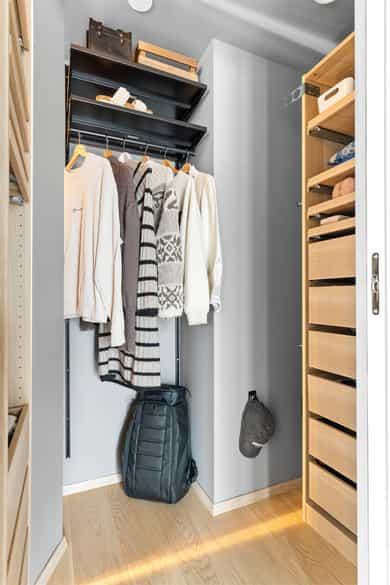 • Fastmontert innredning: garderobe i walk-in, TV-benk på vegg, skoskap i gang, stor kommode utenfor walk-in