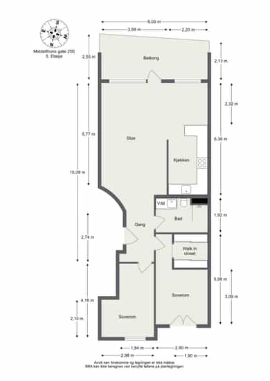 Leiligheten ligger i byggets 5. etasje og består av: Gang, to soverom, stue/kjøkken og bad. I tillegg disponerer boligen en kjellerbod på ca. 3,4 kvm. Garasjeplass nr. 20 medfølger leiligheten. Garasjeanlegget er tilgjengelig via en intern heis i blokken. Lader for el-bil er montert. Sykkeloppstilling og oppstillingsplass for barnevogner: Sameiet har 30-40 plasser for sykkeloppstilling. Du finner dem i første plan i garasjen i Middelthunsgate 25G og under kjørebroen opp til 2 etasje i garasjeanlegget samt utvendig i atrium. Middelthunsgate 21C har også en egen sykkelbod. For adgang til denne trenger du egen nøkkel. Denne bestilles via drifts og koster 500 kroner.