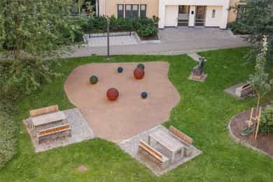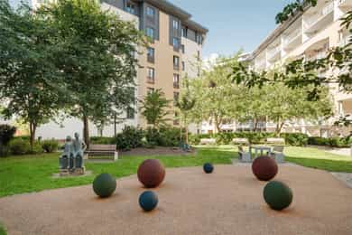 Sameiet har en hyggelig uteområde med beplantning, benker og trær. Ellers har man utrolig kort vei til frodige Frognerparken, omtrent rett over veien.