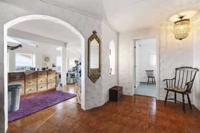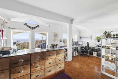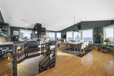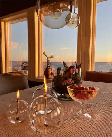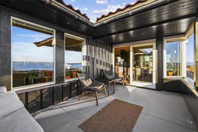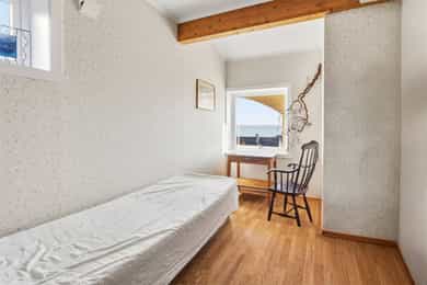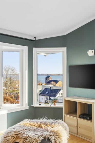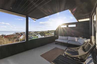 Fra stuen er det utgang til en overbygget balkong med helt fantastik sjøutsikt! Her kan morgen - og formiddagssolen nytes.