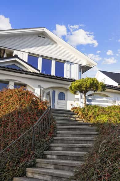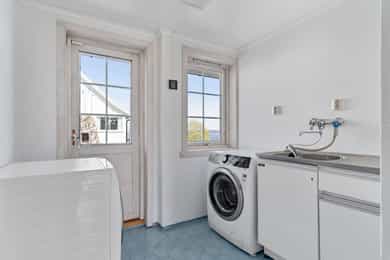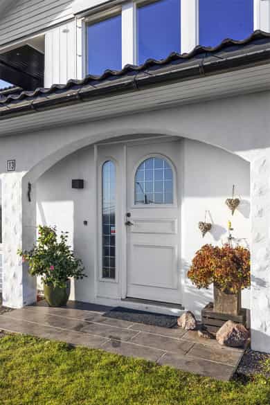 Ved inngangspartiet kan man også nyte morgensolen og fantastisk utsikt. Gårdsplassen er stenlagt, og det er lagt varmekabler i kjørefeltet. Den flotte trappen opp til inngangspartiet har også varmekabler. Uansett hvor man befinner seg på eiendommen kan man nyte den flotte sjøutsikten!