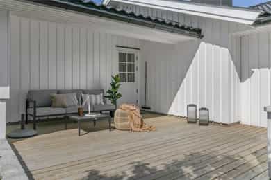 - «Hele» verandaen er restaurert/reparert etter voldsomt regnvær (1.11-2023)som førte til vannlekkasje . info og bilder har jeg fra faglært snekker og blikkenslager.( boligmappa)