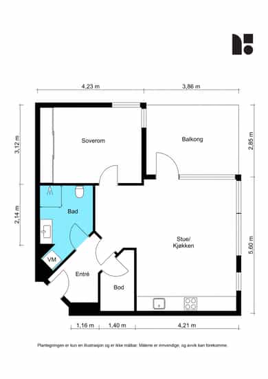 BRA-i: 57 kvm. Entré, bad, stue/kjøkken, soverom, bod