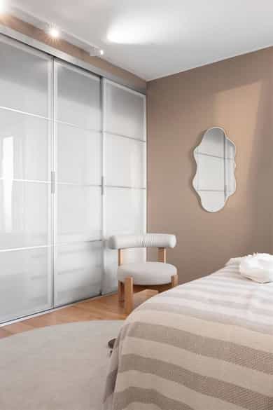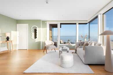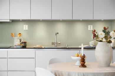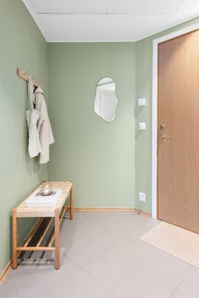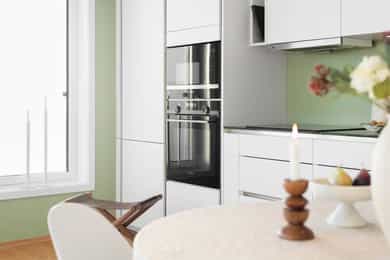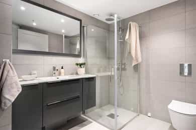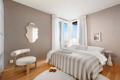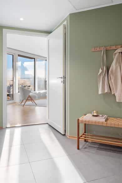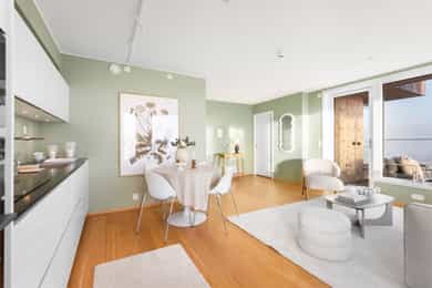 Entrè Velkommen inn til flislagt entrè med gulvvarme. Her har du plass til garderobe og enkel tilgang til å henge fra seg yttertøyet og legge fra seg skoene. Herfra er det videre inngang til innvendig bod, samt baderom. Stue Lys og romslig og med god plass til møblement. Det er ènstavs parkett på gulv og malte flater i en behagelig grønntone. Det er store vindusflater som slipper inn godt med naturlig lys som skaper en god atmosfære. Utsikten er upåklagelig! Fra stuen er det utgang til balkong med god plass til større sittegruppe. Kjøkken Kjøkkeninnredning fra Mobalpa med integrerte hvitevarer som medfølger handelen. Marmor benkeplate som gir et lekkert uttrykk til et stilfullt kjøkken. Det er plass til spisegruppe i overgangen mellom stue og kjøkken. Soverom Det er ett romslig soverom i leiligheten med integrert skyvedørsgarderobe.