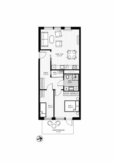BRA-i: 70 kvm. Entré/gang, bad/wc, 2 soverom og stue/kjøkken